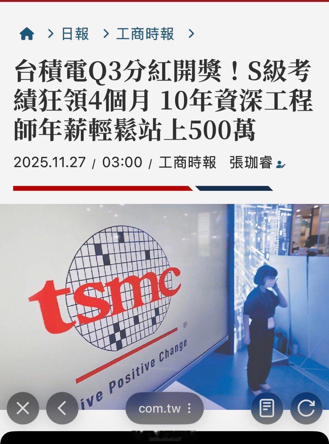台积电公布第三季度绩效评估结果,据媒体报道,绩效评级为S(成功)的员工预计将获得4个月的奖金。此外,对于一名平均工作10年、职级为34的资深工程师,今年总薪酬预计将超过新台币500万元(约合16.3万美元),其中包括基本薪资、奖金以及利润分享。员工所获得的奖金金额还会受到其所在部门绩效表现的影响。