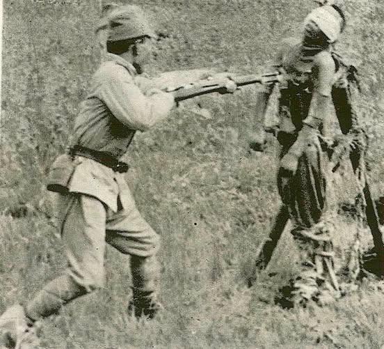 1937年,日军于7月29日攻占天津,至9月5日(照片拍摄时),天津已处于日军占领初期;照片中日军士兵以被俘的中国士兵为活体目标,进行刺刀刺杀练习,日军侵华期间常将战俘、平民作为刺杀训练的“活体目标”,这类照片多是日军自身记录(甚至作为“战绩”炫耀)。