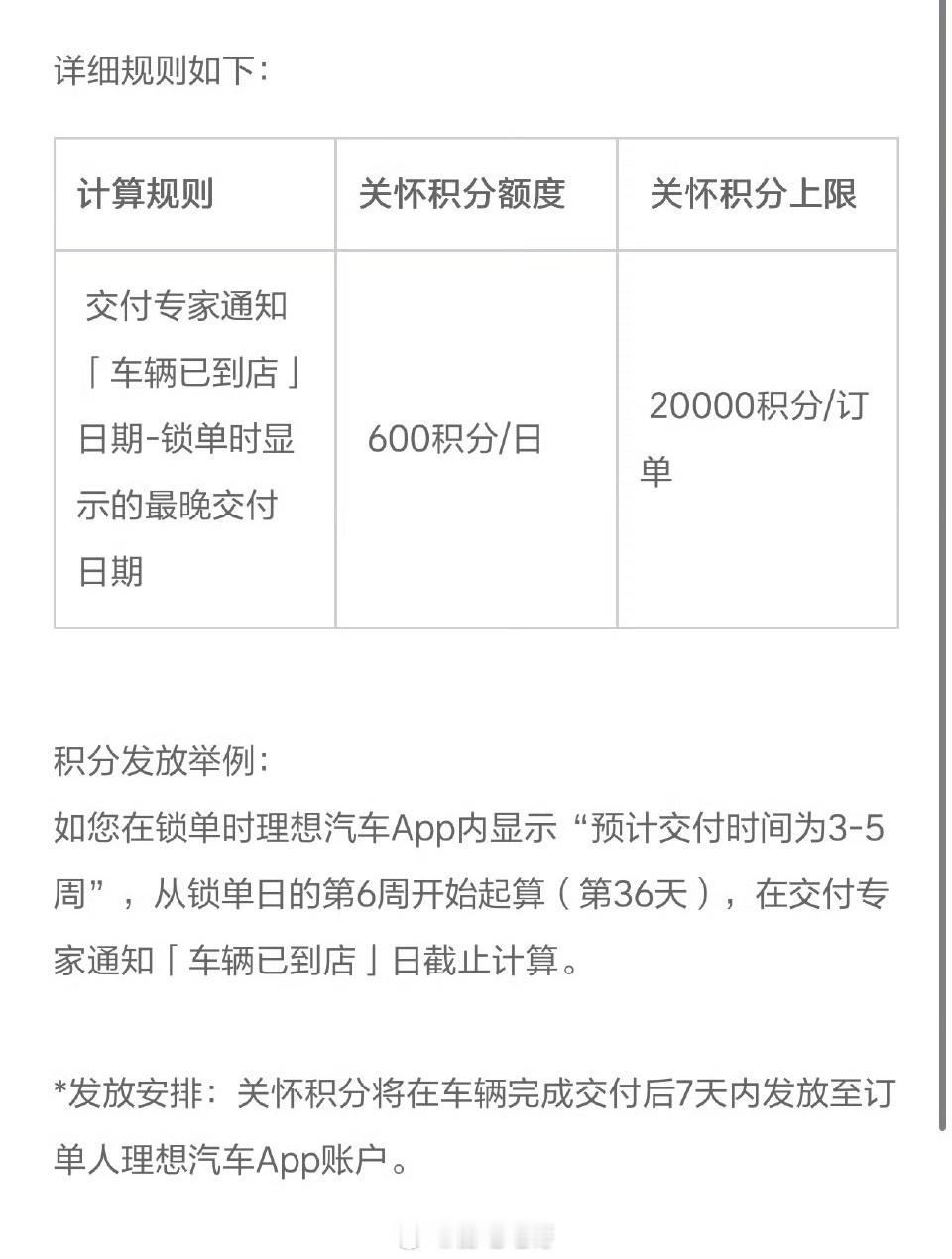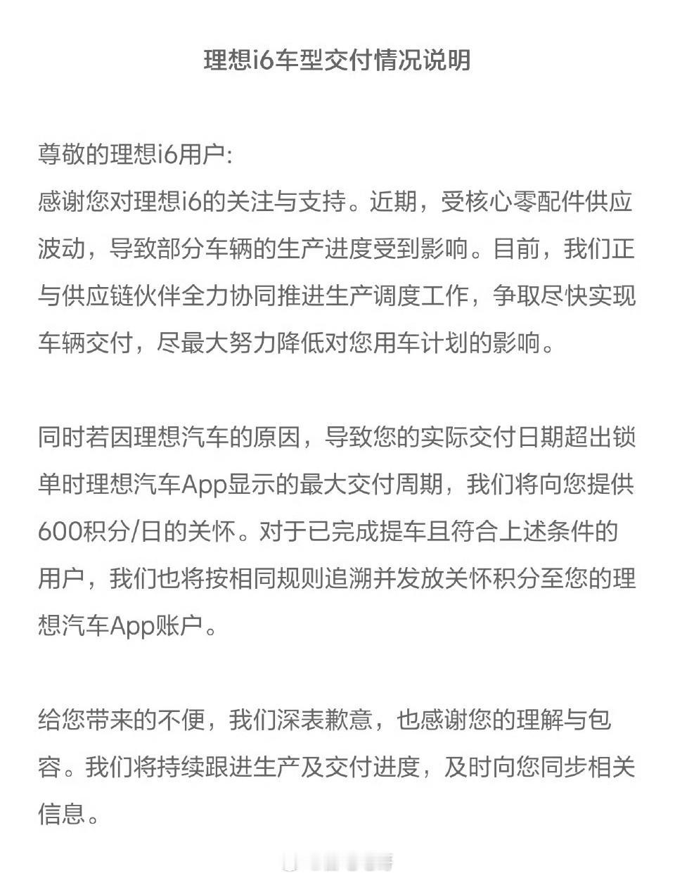 由于近期理想i6的部分核心零配件供应出现波动,导致部分车型的生产进度受到影响。理想也发布了等车关怀方案:因公司原因造成交付超期的用户,将按每日600积分的标准发放,2万分封顶。而且如果是已经提车的用户,只要提车前有延迟也可以追溯补发积分,这点还是很实在的。理想i6理想汽车大v聊车