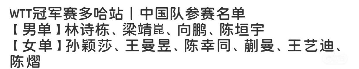 2026WTT多哈冠军赛参赛名单公布—李尚洙继续一舞 明年1月7日—11日的WTT多哈冠军赛参赛名单公布, 国乒参赛选手为, 男单: 林诗栋 梁靖崑,向鹏,陈垣宇 女单: 孙颖莎 王曼昱 陈幸同 蒯曼 王艺迪 李尚洙在法兰克福就宣布退役, 这是想每一场都告别吗? 他这是想世界巡回退, 而且上周, 李尚洙宣布当教练啦, 再见面就是香秀教练, 估计是排名没有退, 强制参赛吧! 加油国乒!