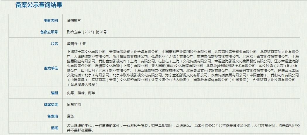 酱园弄下集备案 据国家电影局关于2025年10月下全国电影剧本(梗概)备案、立项公示的通知,电影《酱园弄·下集》正式备案立项。故事梗概:波云诡谲的年代,一桩离奇的案件,一石激起千层浪,究竟真相如何,众说纷纭。当案件原委如片片拼图般被逐步还原,人们才意识到,原来真相已经并不是那么重要。
