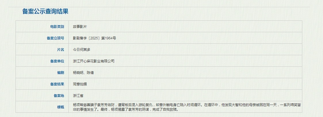 开心麻花新片今日何其多立项 电影《今日何其多》立项,备案单位为浙江开心麻花影业有限公司。故事梗概:杨项帮慈善骗子袁芳芳敛财,遭背叛后混入游轮复仇,却意外触电身亡陷入时间循环。在循环中,他发现大智和他的母亲被困在同一天,一系列啼笑皆非的事情发生了。最终,杨项揭露了袁芳芳的阴谋,完成了自我救赎。