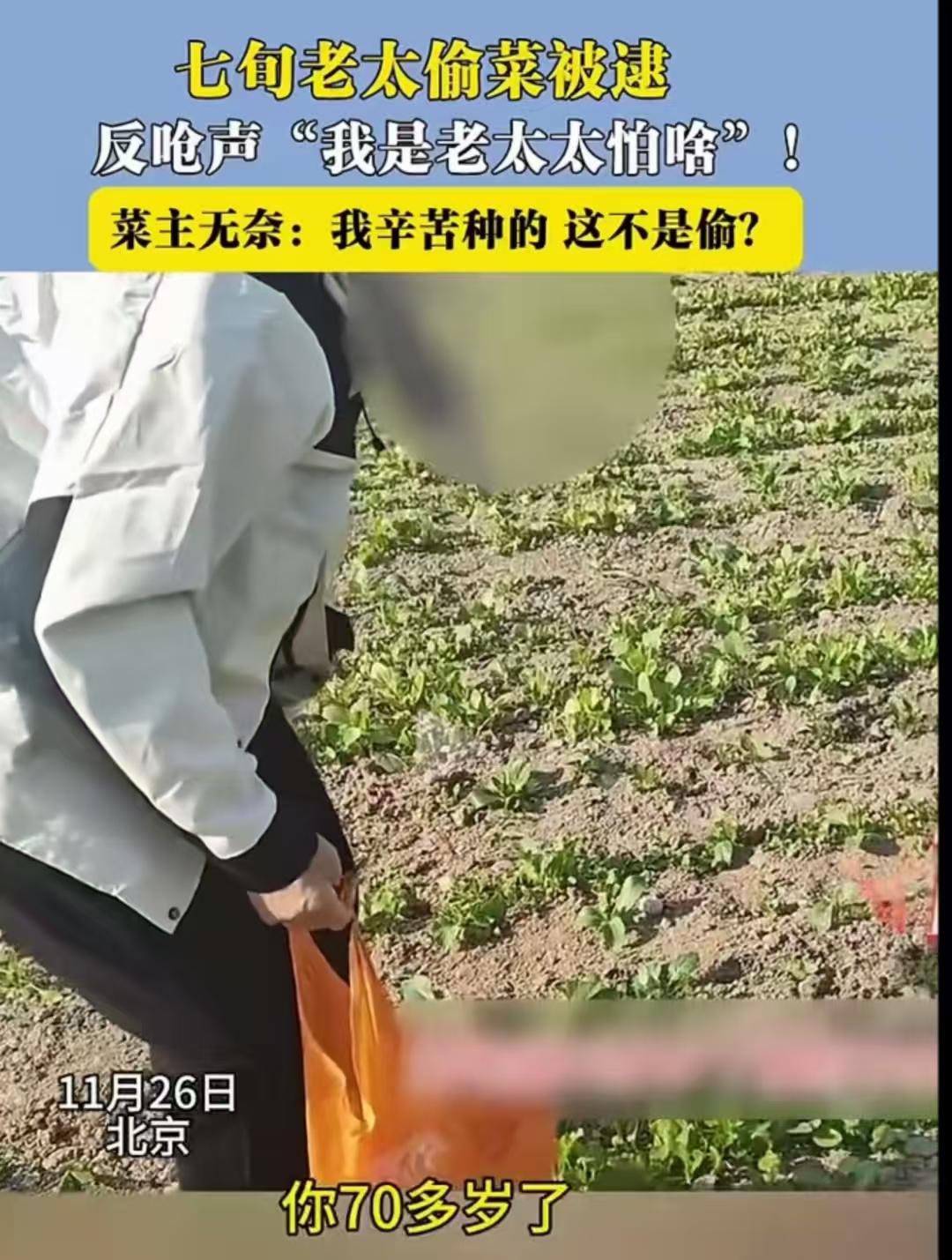 七旬老太太偷菜被逮,反而理直气壮地说:“我是老太太我怕啥?”菜农:“老就可以偷别人的东西吗?我们农民容易吗?” 这天,菜农像往常一样来到自家菜地,准备打理打理蔬菜。刚走到地头,就瞅见一个老太太在自家菜地里摘菜那袋子都快装满了。 菜农瞧着老人年纪大了,想着别直接说人家偷菜,伤了和气,就委婉地开了口:“您是来采摘的呀?我们这采摘收费呢,5块钱一袋,您是给现金还是扫码支付呀?” 谁知道,老太太一听这话,立马就没好气地说:“我没有钱啊,我也不会扫码!” 说完,也不管菜农还在旁边,提着那装满菜的袋子,起身就要走。 菜农赶紧拦住老人,说:“你要花钱把菜买下来…” 可话还没说完,老太太就抢着说:“我都70多岁了!” 菜农有些着急了,说道:“不管您多大岁数,拿别人东西都得付钱啊。您就这么直接把菜摘走,这不是欺负我们农民嘛?我天天起早贪黑,辛辛苦苦种的地,您可不能这么糟蹋啊!” 可这老人呢,不但没觉得自己理亏,反而理直气壮地大声嚷嚷:“我是老太太我怕啥?我又不是偷……” 菜农实在忍不住了,气得直怼:“您这还不是偷啊?这菜又不是您的,这是我的!我就是看您岁数大了,不想跟您计较,您现在就走吧!” 菜农心里也犯嘀咕,这老人年纪大了,万一在自己地里摔倒了,到时候可真是说不清楚,只能咬咬牙让她走了。可看着老人远去的背影,菜农心里越想越气,憋了一肚子火。 此事引发热议,有网友说,太无语了!年龄大了成了金字招牌,免死金牌,成了偷窃的理由。 也有网友说,大家都好好活着,活到70岁,一路吃一路拿,不用出钱。哪个敢炸刺儿?讹他个二三十万! 还有网友说,这不是偷,这是明抢!有种东西是刻在骨子里的,这辈子都改不了。 我认为,这老太太的行为,看似是倚老卖老,实则反映出的是部分人规则意识的淡薄和道德底线的缺失。 年龄大从来都不是逃避责任、违反规则的借口,更不能成为肆意侵犯他人权益的“挡箭牌”。 在社会这个大家庭中,每个人都应该遵守基本的道德和法律规范,尊重他人的劳动成果。如果都像这位老太太一样,以年龄为“武器”,随意践踏规则,那社会的秩序将如何维持?公平正义又将何以保障? 我们不能因为一个人的年龄而对其错误行为姑息纵容,而应该让每个人都明白,无论年龄大小,都要为自己的行为负责。只有这样,我们才能构建一个更加和谐、有序、公平的社会环境!