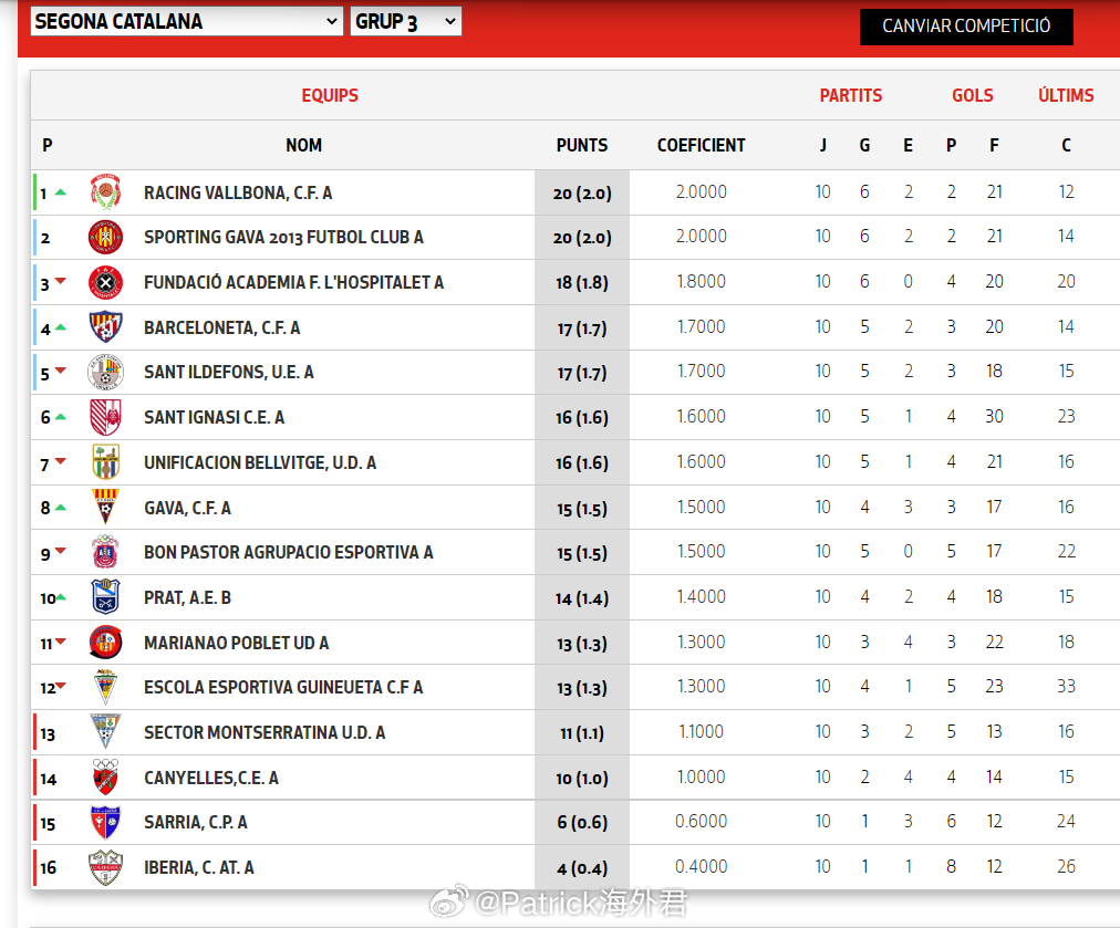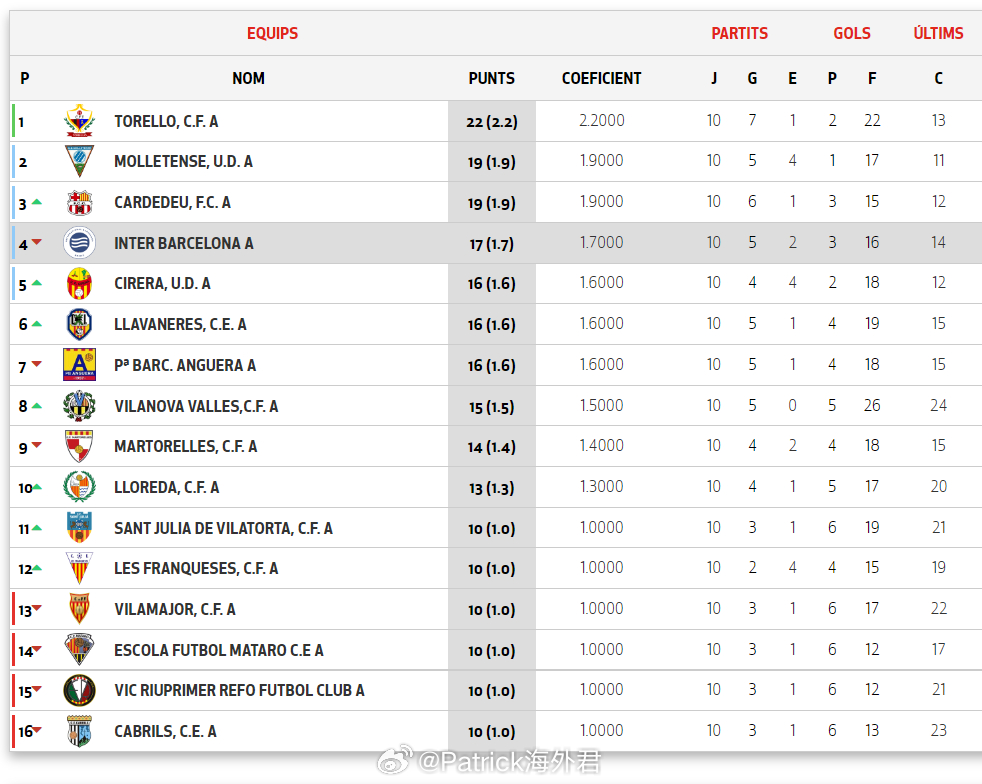 留洋-积分榜 西班牙加泰罗尼亚乙级联赛(8) 刘昊雨 十轮战罢,联赛已进行三分之一,以下是球员情况。第2组◉ 第4名:巴塞罗那国际战绩 5胜2平3负、进失球16-14,积17分刘昊雨(05) 出场10次、首发1次,场均出场28分钟,进1球孙高城(07) 进入替补席8次,出场0次第3组◉ 第3名:FAF奥斯皮塔莱特战绩 6胜0平4负、进失球20-20,积18分王健波(05) 进入替补席2次,出场0次◉ 第12名:吉纳埃塔体校战绩 4胜1平5负、进失球23-33,积13分陈欧翔(05) 出场9次、首发5次,场均出场57分钟,进1球