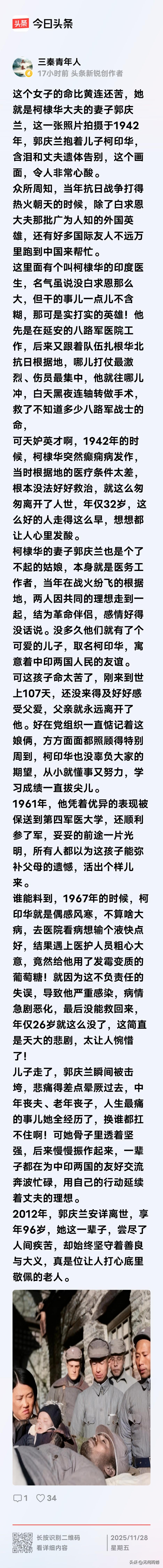 柯棣华大夫遗容照片,看起来是非常清晰的,为了支持中国人民的抗日事业,他和白求恩一样,来到我们这里救治伤员,后来不幸因病逝世,刚刚30多岁。今天才知道,他的妻子原来是中国人,照片中抱着小孩的这个女子,就是他的妻子!