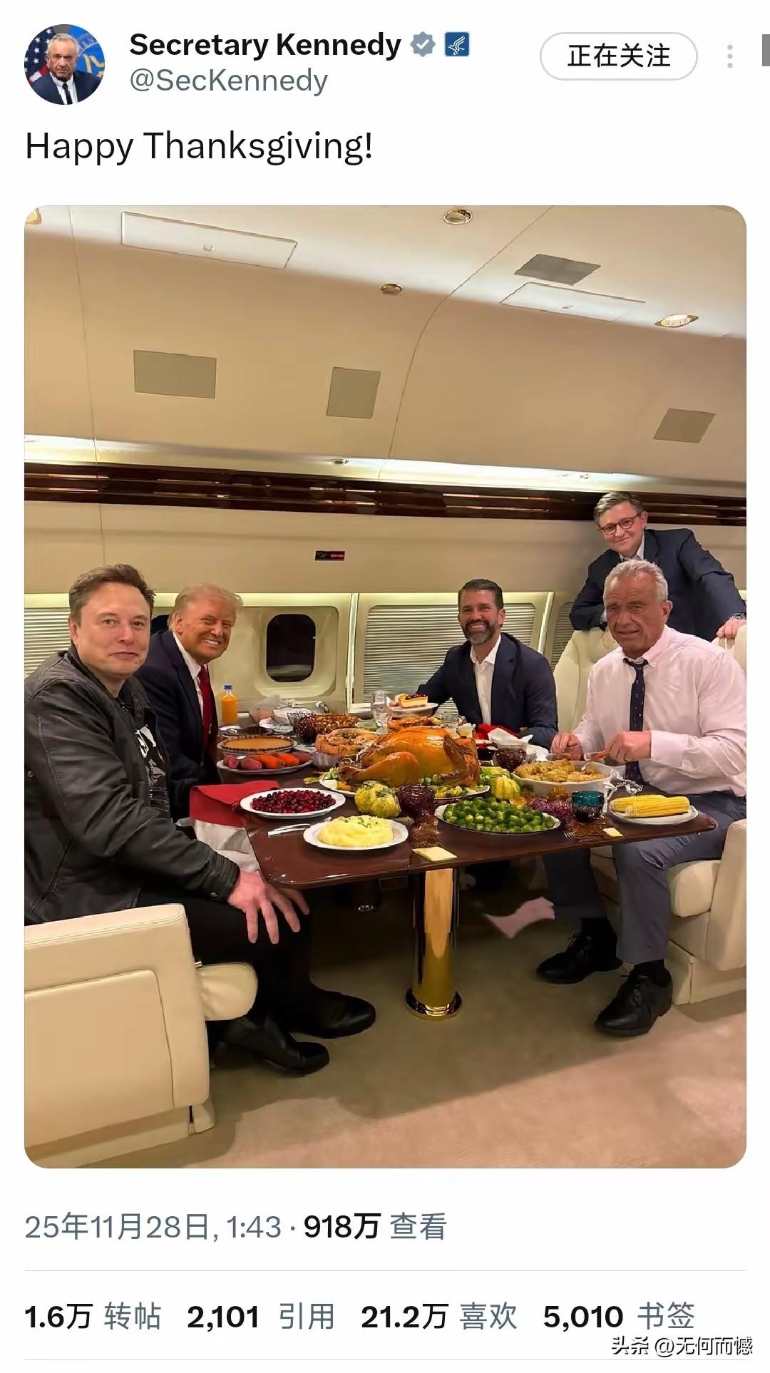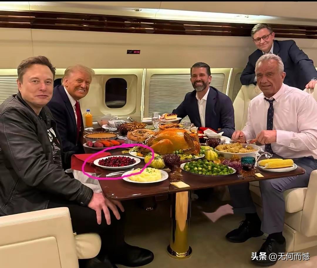 特朗普感恩节和马斯克共餐,桌上的菜品很丰富,有一只大大的火鸡,好像还有一盘地瓜,其他的菜也看不出来是什么,不知道这样的大餐是属于西餐吗?看得出来,特朗普很开心,满脸都是笑容,感觉他好长时间都没有和马斯克在一起吃饭了!
