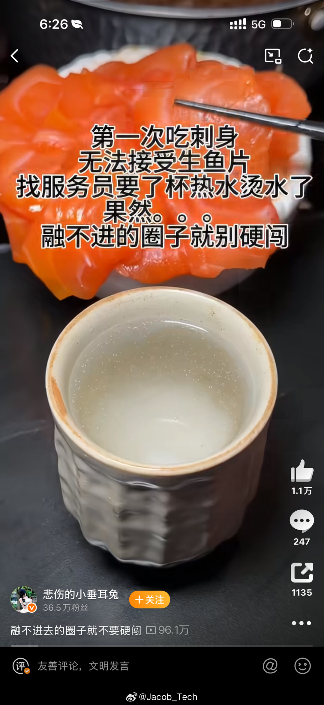 吃生鱼片要了杯热水 啊…不是,其实不喜欢吃的话可以不吃的呀没必要搞得这么狼狈吧