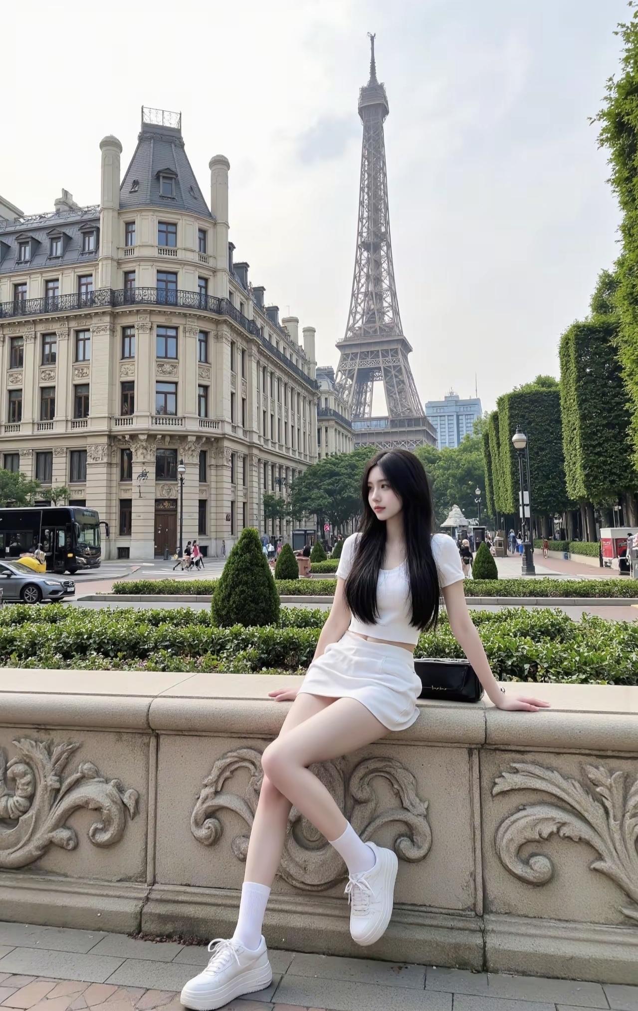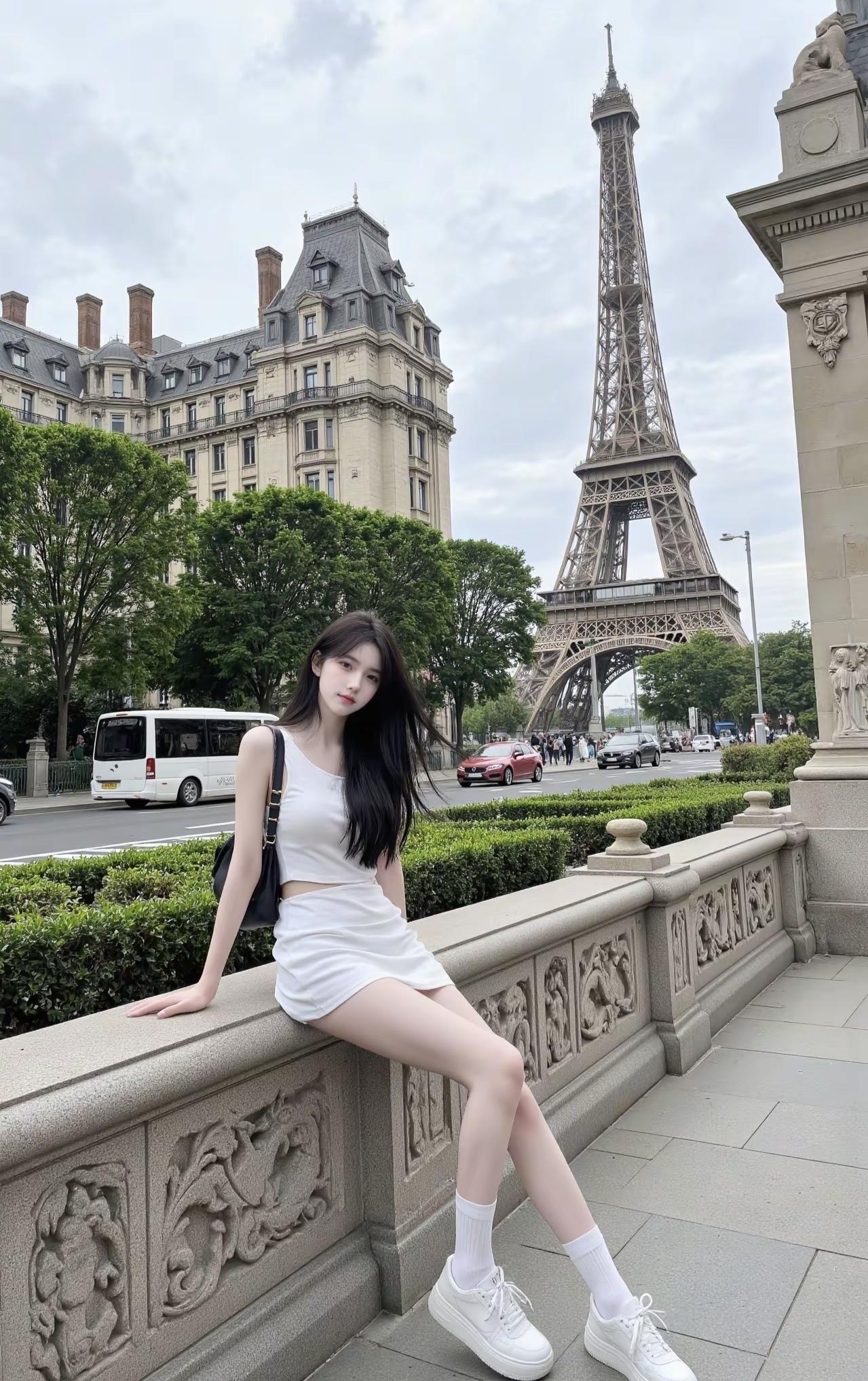 风裹着巴黎的松弛感,从埃菲尔铁塔尖儿飘到裙摆边。白裙和街景撞了个温柔的满怀,连时间都慢成了镜头里的光斑。
