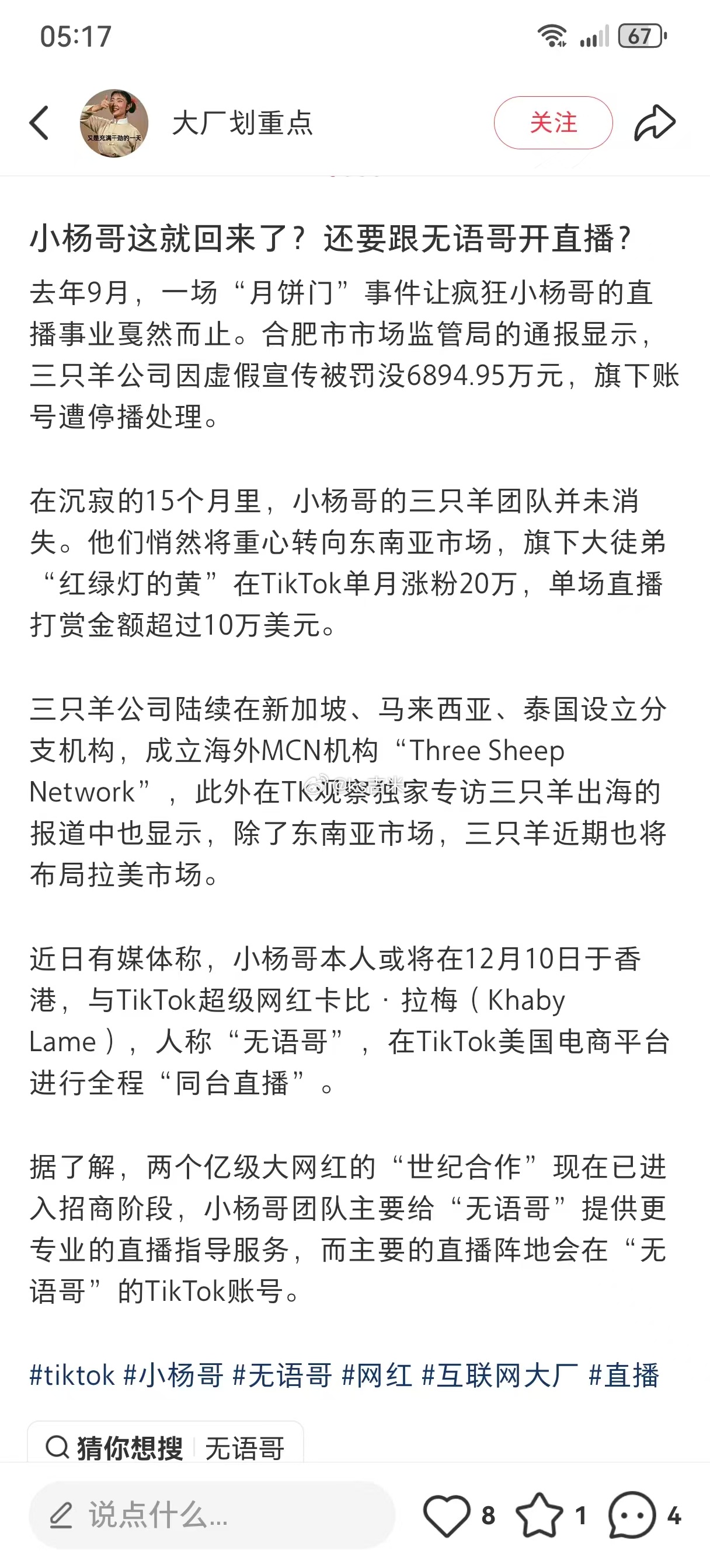 网传小杨哥本人或将在12月10日于香港,与TikTok超级网红卡比·拉梅(KhabyLame),人称“无语哥”,在TikTok美国电商平台进行全程“同台直播”。据了解,两个亿级大网红的“世纪合作”现在已进入招商阶段,小杨哥团队主要给“无语哥”提供更专业的直播指导服务,而主要的直播阵地会在“无语哥”的TikTok账号。这或将是继2024年9月以来,小杨哥本人首次正式复播并出现在大众视野。曝小杨哥12月10号开播新浪娱乐