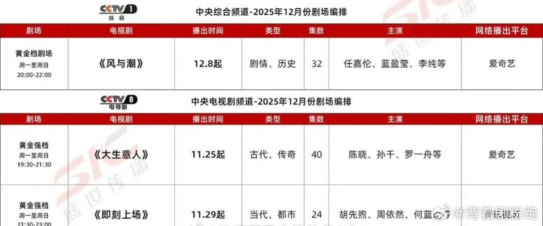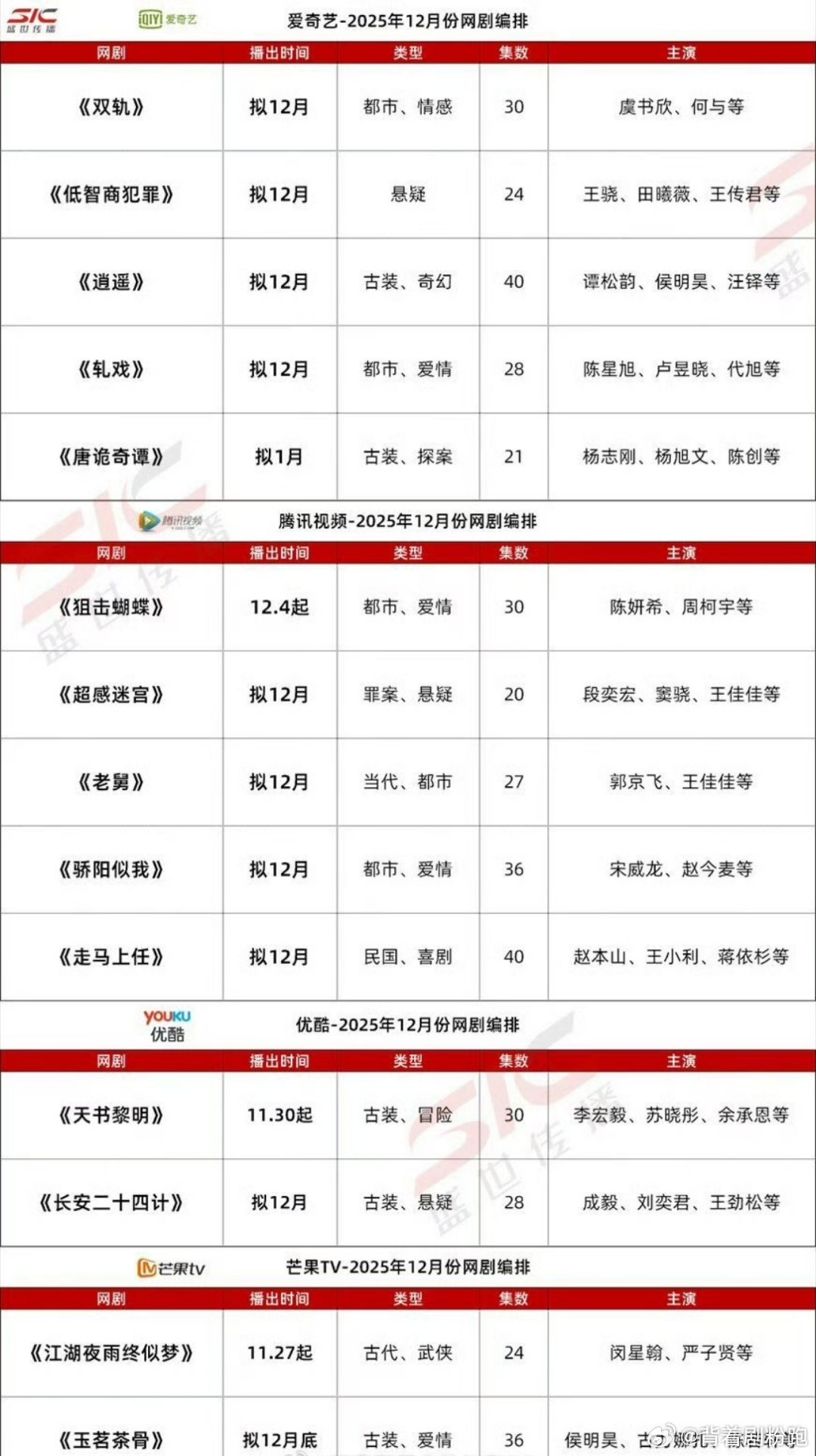 各大平台12月预排大剧 虞书欣、何与《双轨》王骁、田曦薇《低智商犯罪》谭松韵、侯明昊《逍遥》陈星旭、卢昱晓《轧戏》杨志刚、杨旭文《唐诡奇谭》陈妍希、周柯宇《狙击蝴蝶》段奕宏、窦骁《超感迷宫》郭京飞、王佳佳《老舅》宋威龙、赵今麦《骄阳似我》赵本山、王小利《走马上任》李宏毅、苏晓彤《天书黎明》成毅、刘奕君《长安二十四计》侯明昊、古力娜扎《玉茗茶骨》