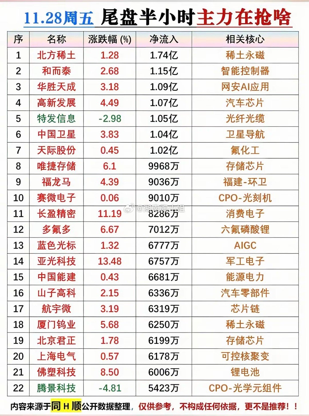 11.28周五 尾盘半小时 主力在抢啥股?尾盘主力抢筹焦点:1.稀土永磁2.军工,卫星3.存储芯片4.CPO光刻机,光学组件