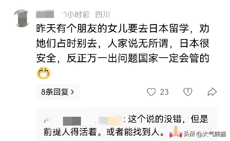 这都是什么心态? 有网友在评论区指出,昨天有个朋友的女儿要去日本留学,大家劝她们暂时别去,可人家却说无所谓,认为日本很安全,反正万一出问题的话国家一定会管的。 说白了,这些人就是被惯的,有关部门不止一次发出警告,而现在也时常看到国人在日本被谩骂殴打的新闻,但有的人就是不屑一顾,自认为自己很聪明,还说万一出了什么问题国家会出面相助,国家的提醒已经尽到了责任,如果自己还是一味执意要去日本,那后果就应该自负。