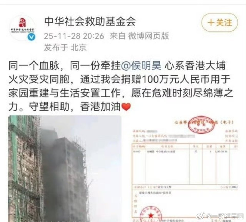 李昀锐 捐赠50万元人民币支援香港火灾!愿平安