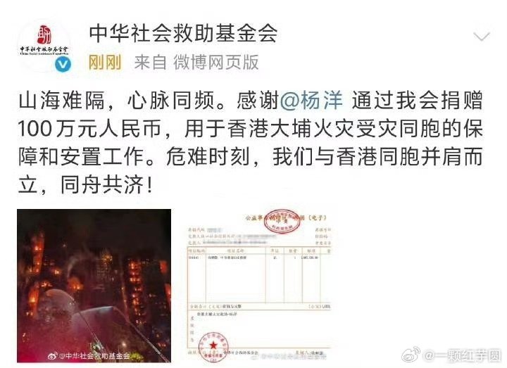 刘宇宁 使用个人账户向香港火灾居民捐赠100万!一起为他们加油