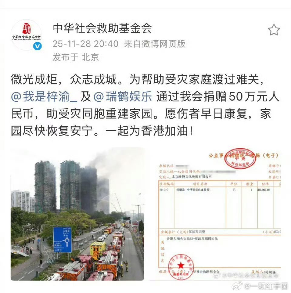 李昀锐 捐赠50万元人民币支援香港火灾!愿平安