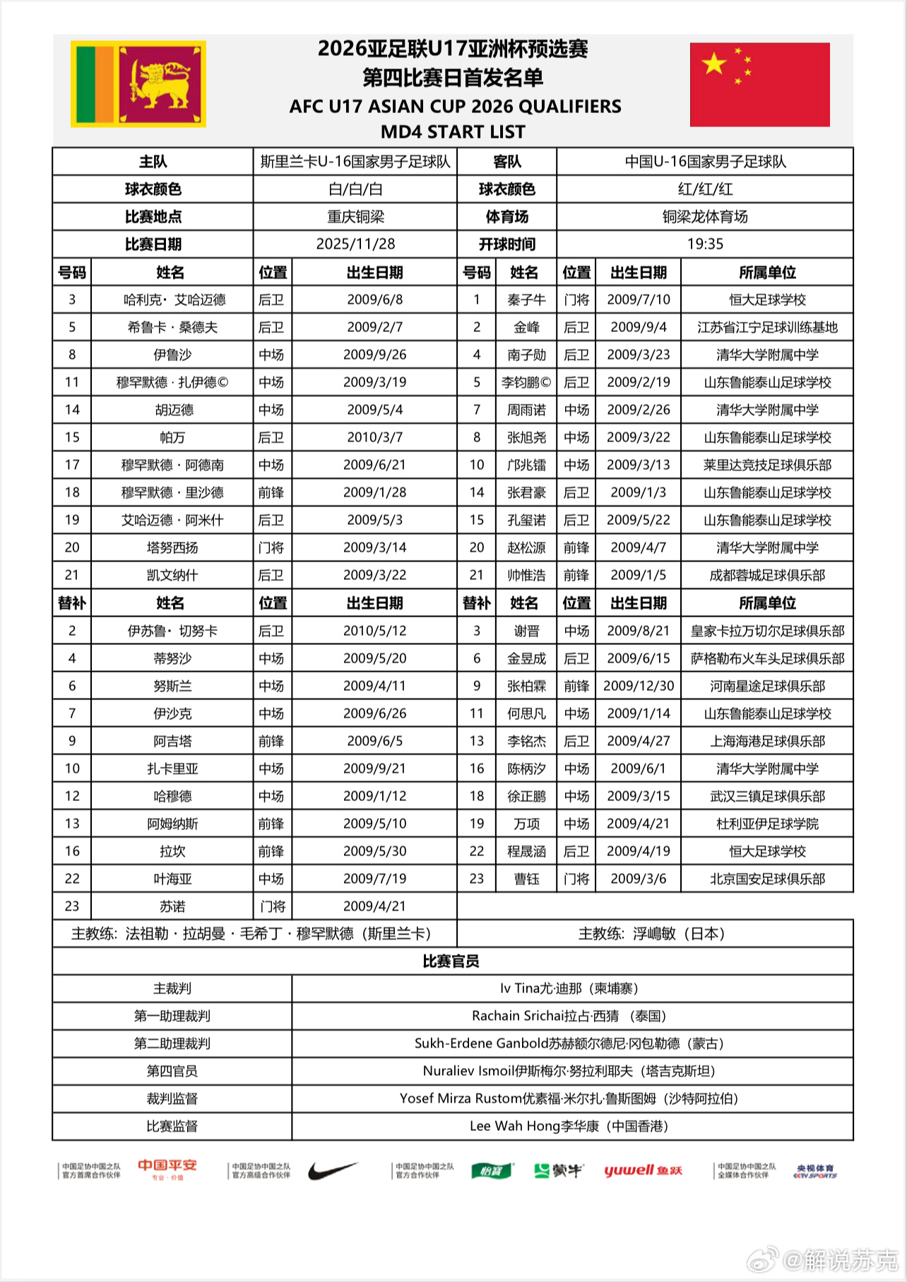 U17亚洲杯,中国vs斯里兰卡首发阵容。再来一张,现场月亮吧直出,大师我这还行吗