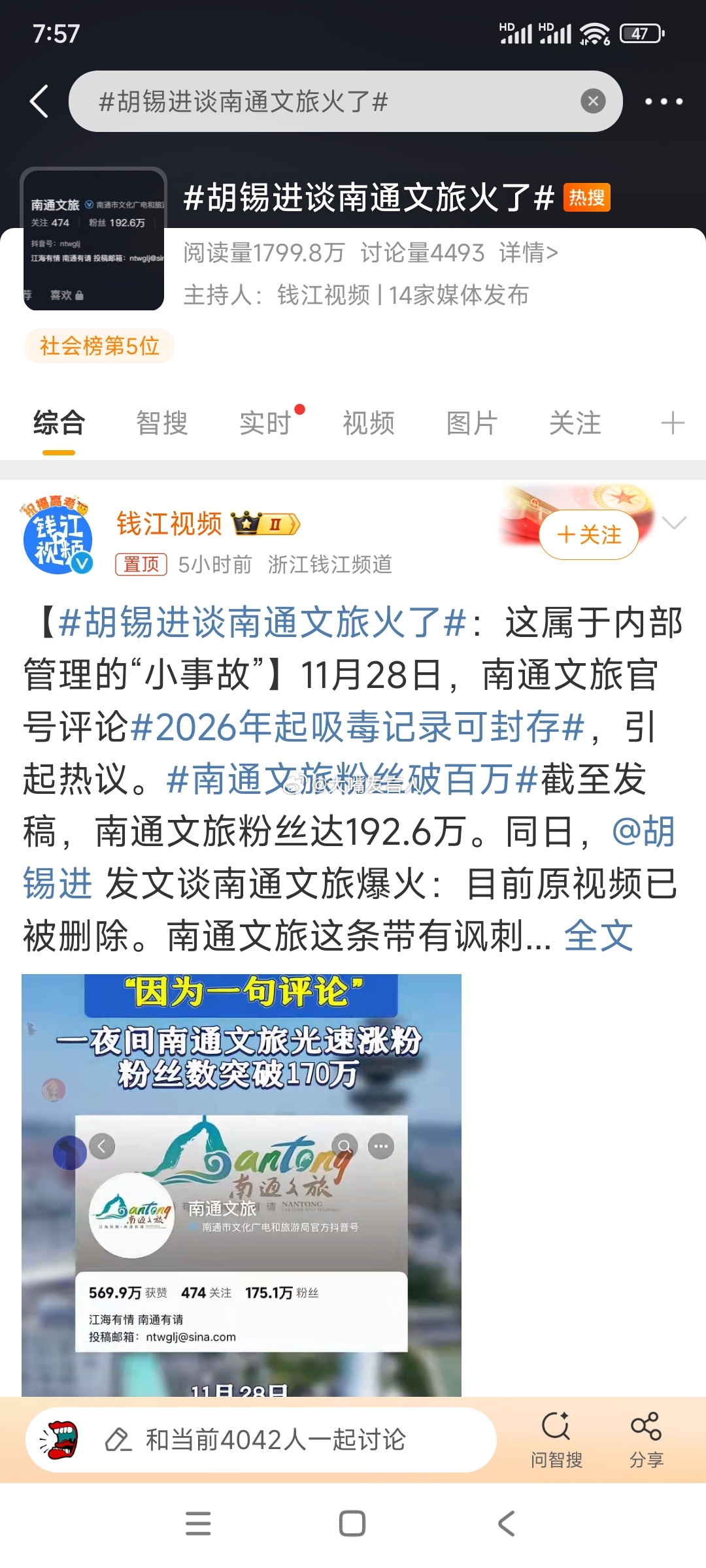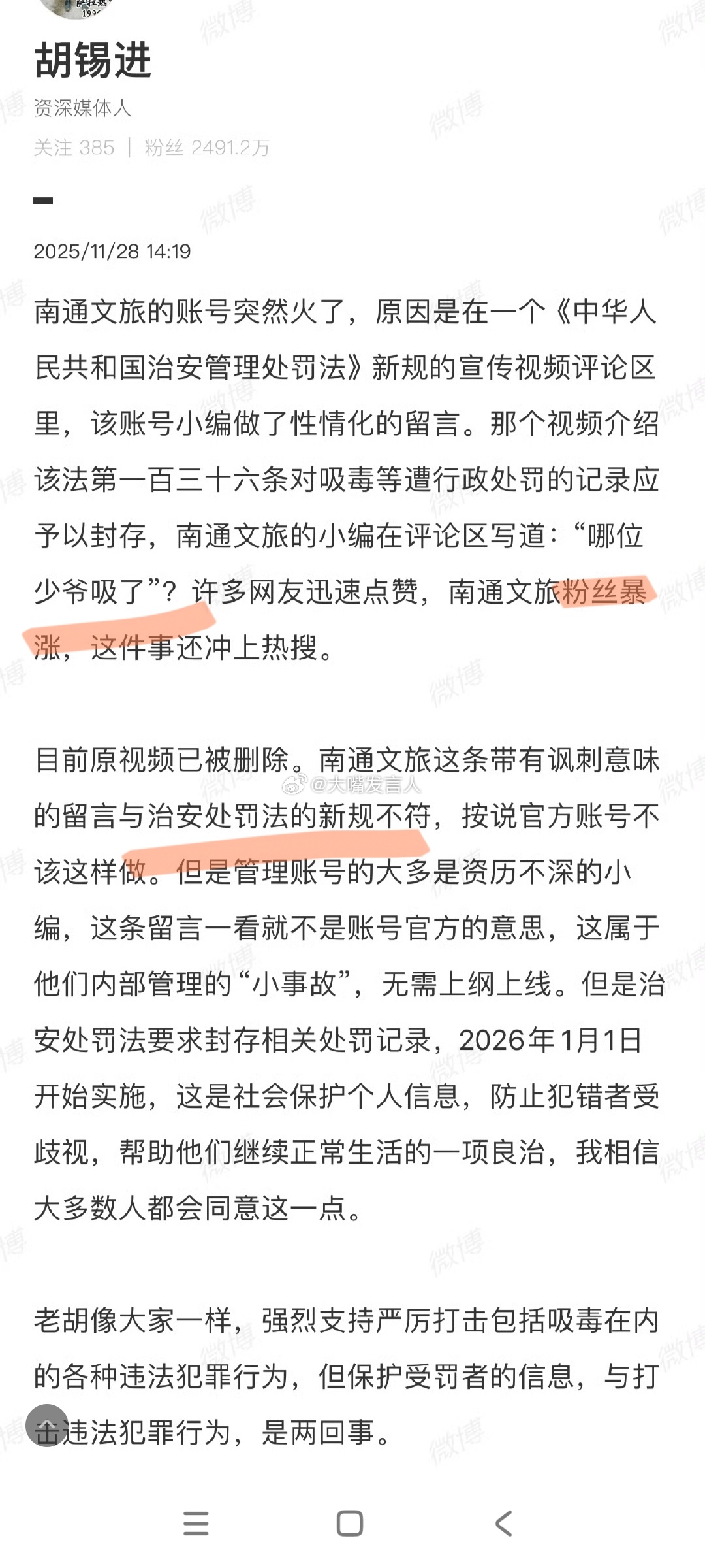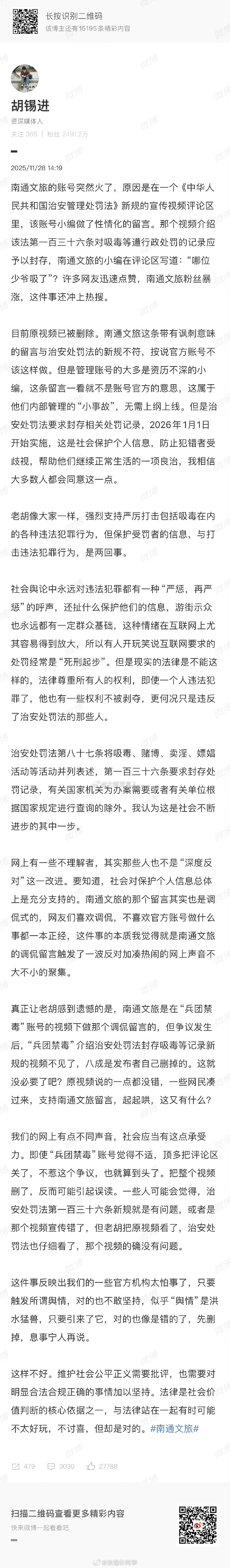 胡锡进谈南通文旅火了 怎么哪都有他?他凭什么把南通文旅小编写的,哪位少爷吸了,定性为与治安处罚法不符?他看到少爷二字,联想到什么了?人家写6个字,他给定性要处罚,那他三年前建议佩骡西访台时伴飞击落,让很多网民误以为他替官方传话,他算什么?热点观点 ,南通文旅 ,南通文旅粉丝量破200万