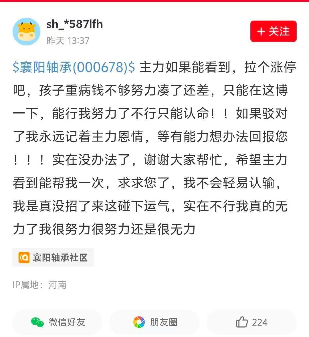 谁家孩子生病靠股市挣钱啊? 今天襄阳轴承涨停,网友都夸主力仁义! 但一细想,谁家孩子生病差治疗费,靠股市挣钱啊?不应该早早提出来先治病救人吗?再不济,也可以求助轻松、水滴等平台。 随着事件的发酵,网友都猜测大概率是小作文。 以目前网友的能力,基本上梦查清事实,还有就是看看该博主还会不会发文。