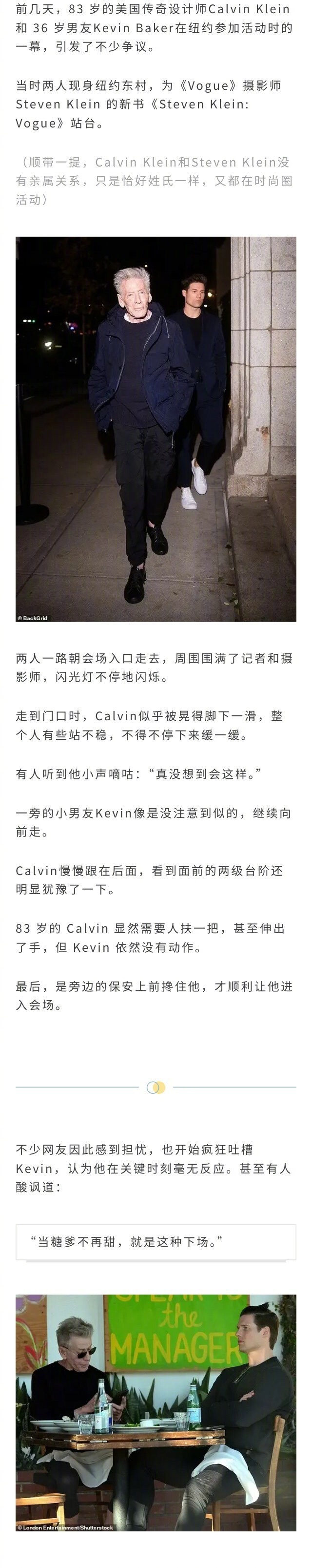 83岁CK创始人携36岁小鲜肉男友出席纽约活动,在门口踉跄差点摔倒,小男友却一直插兜漠视,最后还是保安搀扶?