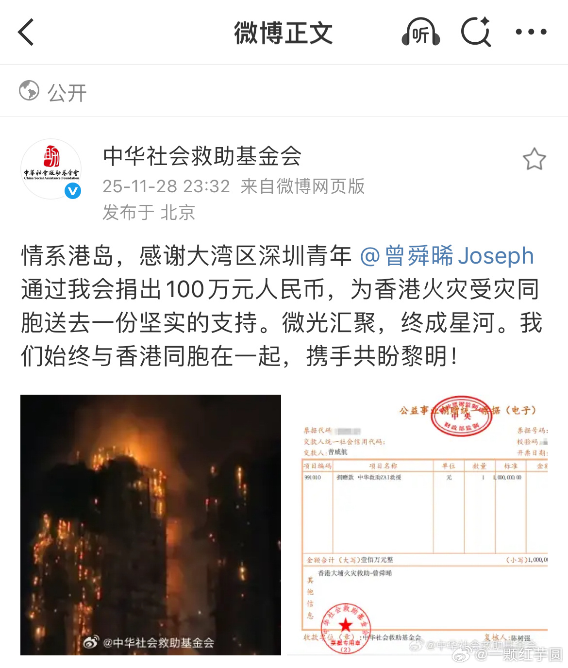 曾舜晞通过中华社会救助基金会向香港灾区捐出100w!爱的力量,我们终会度过难关