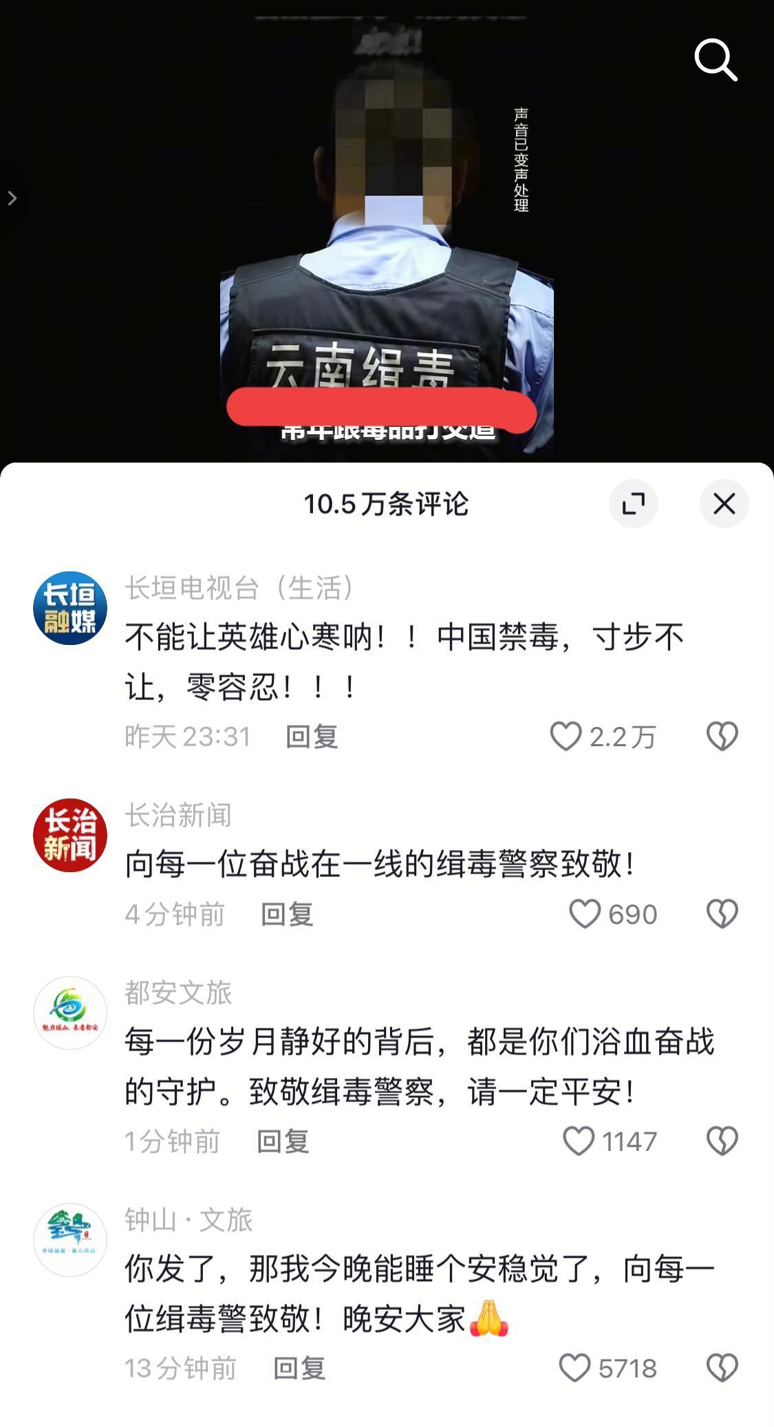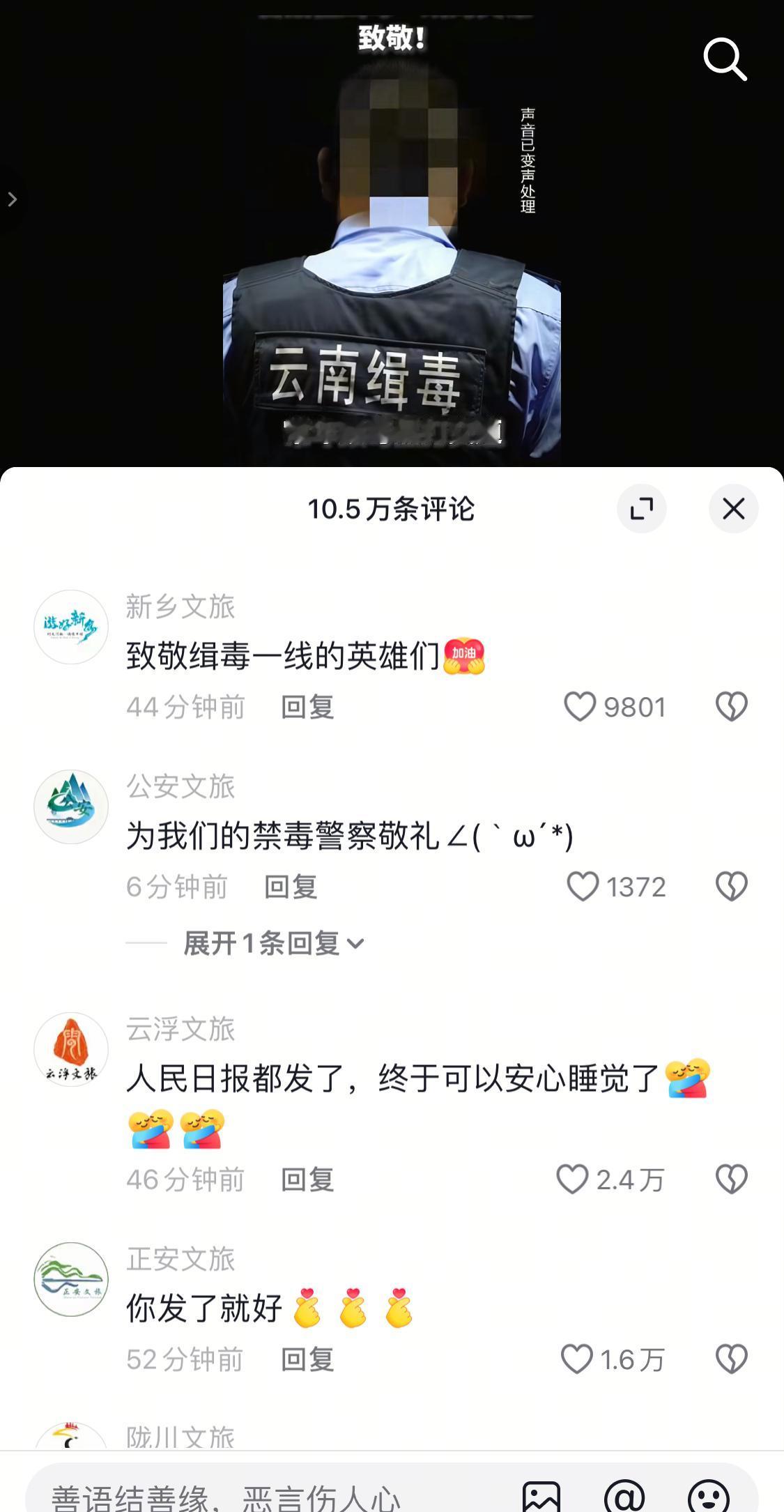 缉毒最难的云南缉毒抖音官方账号搜不到了,不过看到云南日报抖音官方账号连发十条云南缉毒视频,其中一条视频更是被人民日报的抖音官方账号转发,很欣慰。 更让人欣慰的是,人民日报转发的这条视频的评论区,汇聚了无数来自各地方官媒和网友们的应援。 所以,不管云南禁毒抖音号是因集中整合而主动放弃还是其它原因,所有正常人对缉毒的态度是一致的。中国缉毒,永远保持零容忍、寸土不让!向所有奋战在缉毒最前线、只有牺牲了且无三代直系才会公开“名字”的缉毒警察们致敬!