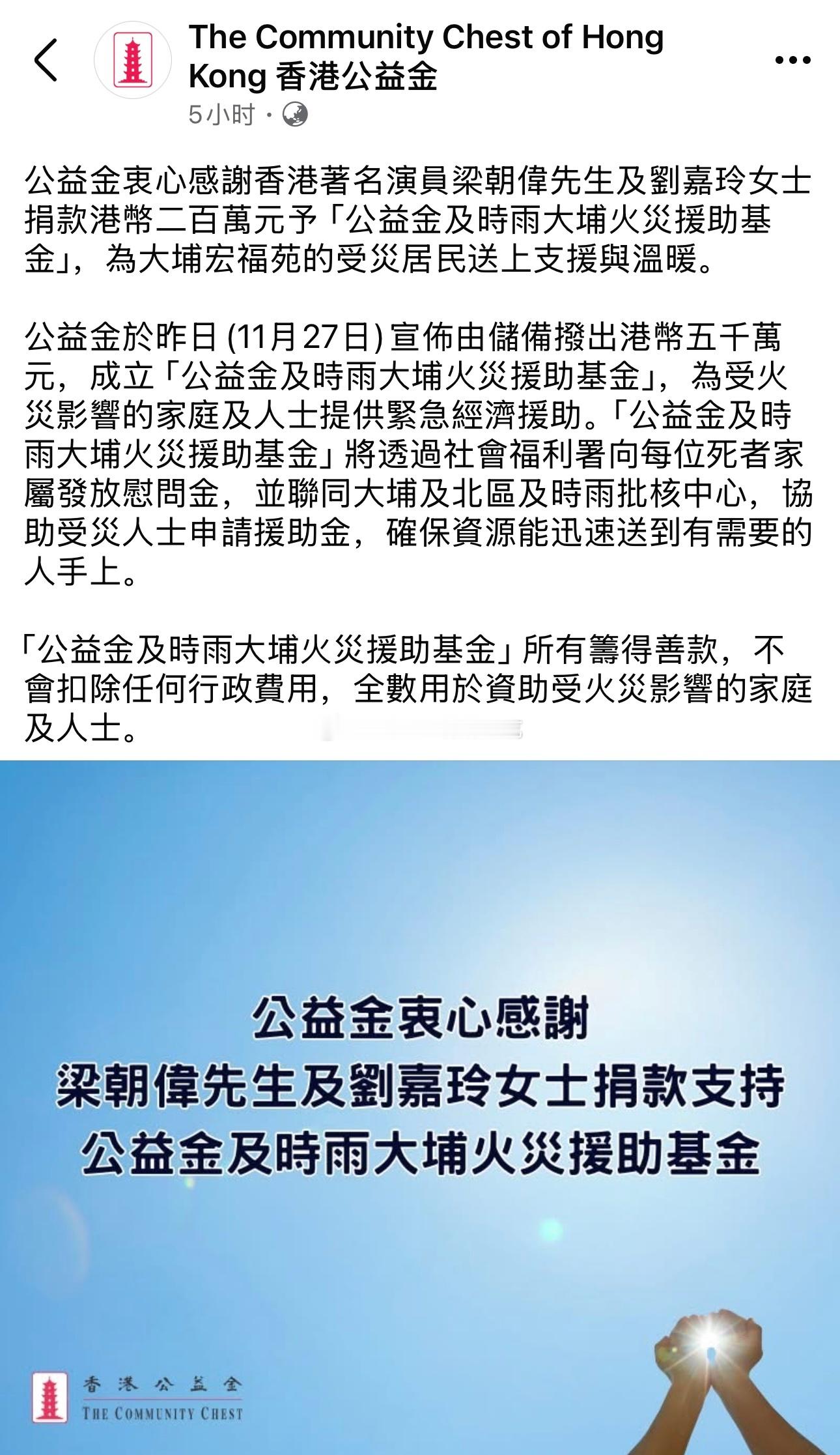 梁朝伟刘嘉玲捐款港币200万元,为大埔宏福苑的受灾居民送上支援与温暖。