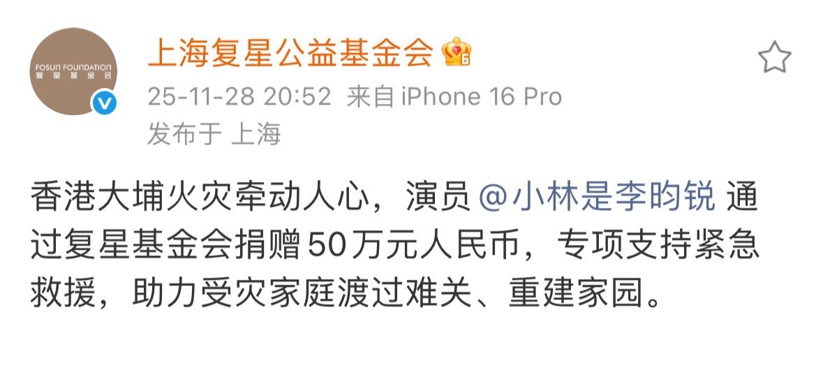 李昀锐捐赠50万元李昀锐通过复星基金会捐赠50万元人民币,专项支持紧急救援,助力受灾家庭渡过难关、重建家园李昀锐为香港捐赠50万元