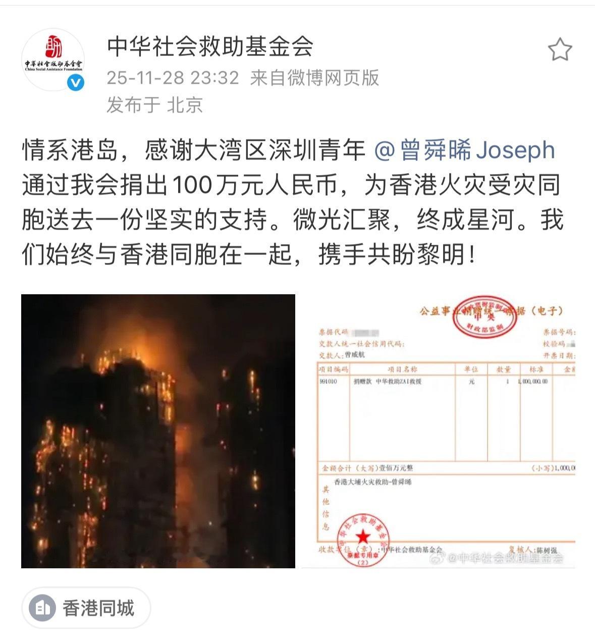 曾舜晞为香港捐赠100万元曾舜晞通过中华社会救助基金会捐赠100万元人民币,为香港火灾受灾同胞送去一份坚实的支持,一起携手共盼黎明曾舜晞捐赠100万