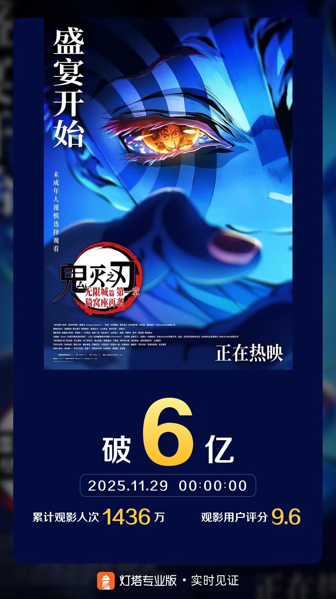 鬼灭之刃无限城篇票房破6亿 据灯塔专业版实时数据,截至11月29日0时0分,影片《鬼灭之刃:无限城篇 第一章 猗窝座再袭》票房突破6亿。电影鬼灭之刃