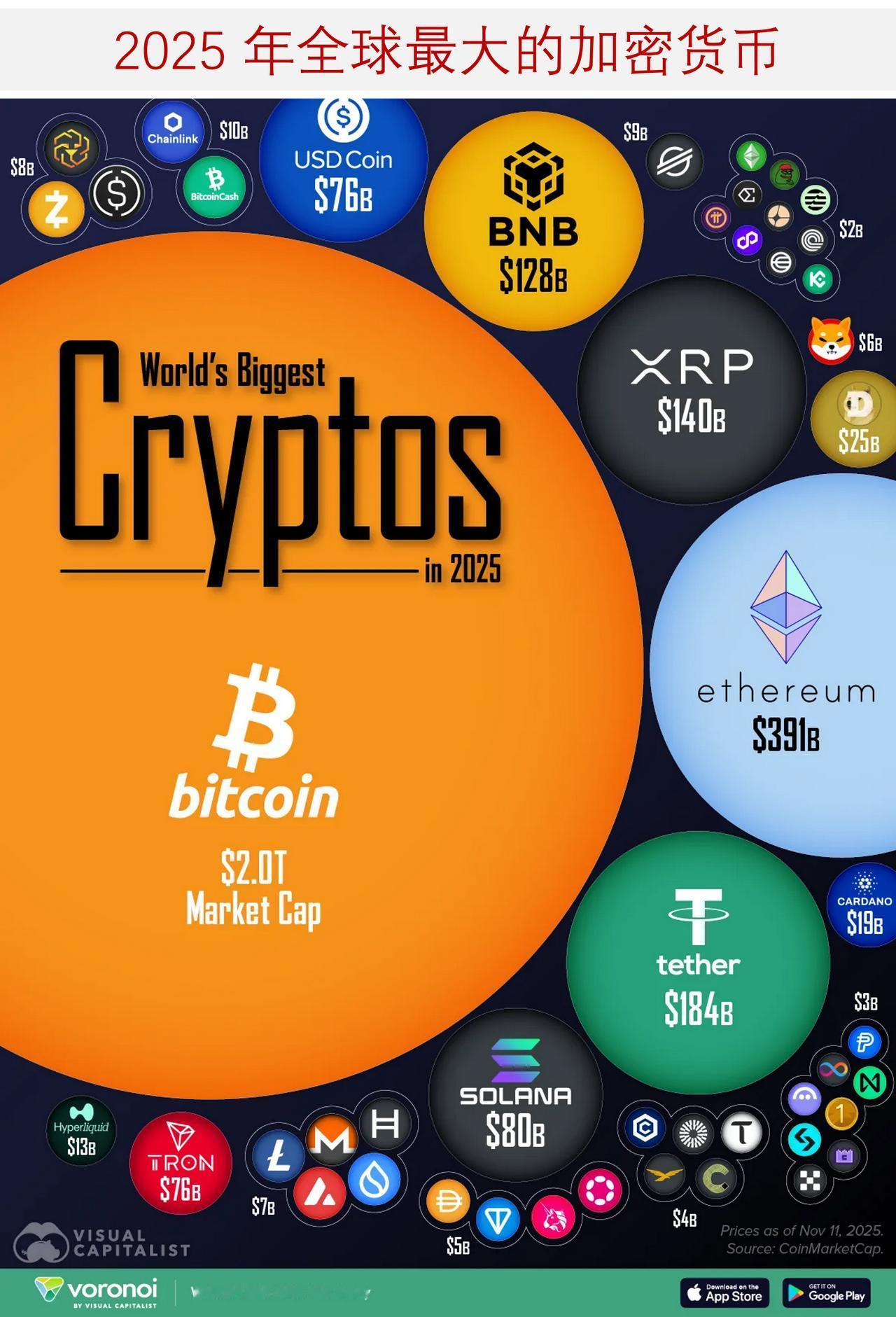2025 年全球最大的加密货币是什么? 全球加密货币的总市值接近 3 万亿美元。下面图表列出了 2025 年全球最大的加密货币,展示了其价值在主要网络、稳定币以及新兴数字资产中的分布情况。 此图表的数据来源于 CoinMarketCap。它展示了截至 2025 年 11 月 11 日,最大规模加密货币的最新市值数据。市值是通过将代币价格乘以其流通供应量得出的。 ——比特币和以太坊继续占据主导地位 比特币仍占据着明显的市场主导地位,市值近 2 万亿美元,这表明其作为最广泛持有且得到机构认可的加密资产的地位。以太坊以 3910 亿美元的市值紧随其后,得益于其作为领先智能合约平台的地位。这两者共同构成了加密货币领域的核心部分。 榜单中的其他顶级加密货币还包括第一层网络,如Solana、币安币和艾达币。 ——稳定币的兴起与替代第一层网络的发展 稳定币是一种旨在保持稳定价值的加密货币,通常通过与法定货币、商品或其他金融工具挂钩来实现这一目标。它们充当了传统金融与数字市场之间的桥梁,提供价格稳定性,使其适用于交易、支付和链上价值存储。 像泰达币(Tether)和USDC这样的稳定币如今在市场中占据了重要地位,其市值分别达到 1840 亿美元和 760 亿美元。 它们的迅速增长反映了在交易所、支付网络以及去中心化金融应用中,对具有可靠性和与美元挂钩的资产需求的不断上升。 ——新兴资产与新进入者 除了那些主要的参与者之外,一系列中等规模的代币也获得了关注和认可。 像 Hyperliquid、Chainlink 和 Hedera 这样的项目凸显了对诸如预言机数据、流动性基础设施以及企业级网络等专业工具的强烈需求。由网络热梗和社区主导的代币,包括狗狗币、柴犬币和PEPE币,尽管基本面较为不稳定,但因其文化影响力而仍备受关注。