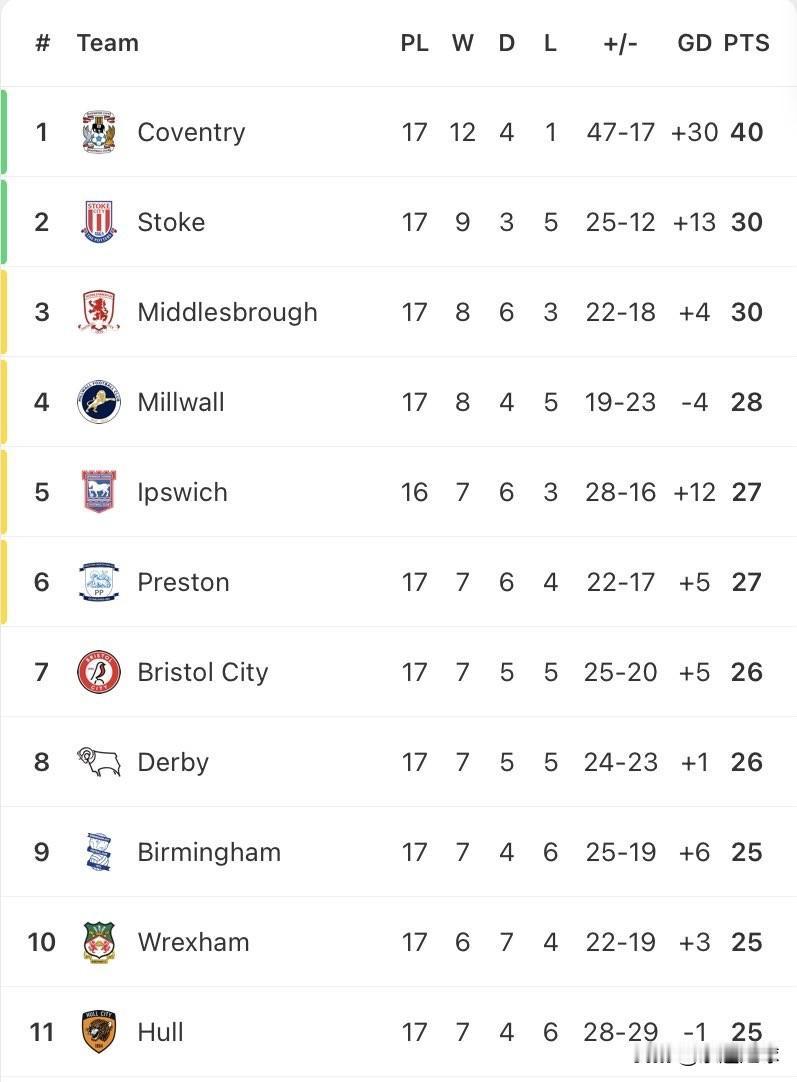 本赛季英冠联赛的升级争夺战真是来真的了! 十七轮战罢,联赛上半区有多达11支俱乐部已至少七年未曾出现在顶级联赛! 🏴 考文垂(24年未升超) 🏴 斯托克城(7年未升超) 🏴 米德尔斯堡(8年未升超) 🏴 米尔沃尔(35年未升超) 🏴 普雷斯顿北区(64年未升超) 🏴 布里斯托尔城(45年未升超) 🏴 德比郡(17年未升超) 🏴 伯明翰城(14年未升超) 🏴 雷克瑟姆(从未升超) 🏴 赫尔城(8年未升超) 🏴 女王公园巡游者(10年未升超)