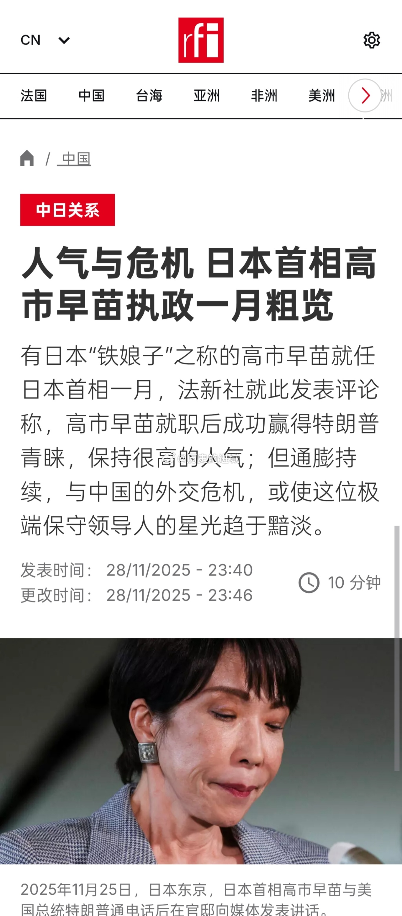 高市早苗就任日本首相一月,法新社发表评论称,高市早苗就职后成功赢得特朗普青睐,保持很高的人气;但通膨持续,与中国的外交危机,或使这位极端保守领导人的星光趋于黯淡。美国雪城大学马克斯韦尔学院分析师玛格丽塔.埃斯特韦斯-阿贝认为,中国 “有很多的经济杠杆来惩罚日本,而东京却没有”。其他潜在的报复措施可能包括中国限制对日稀土出口或限制日本产品出口中国。这位专家对法新社称,任命以保守著称的高市早苗担任首相“在日本经济形势微妙时刻对中日关系是一个非常冒险的选择”。这位专家还称:“在没有事先计划好的情况下与更强大的人交战并非体现'领导力'”。