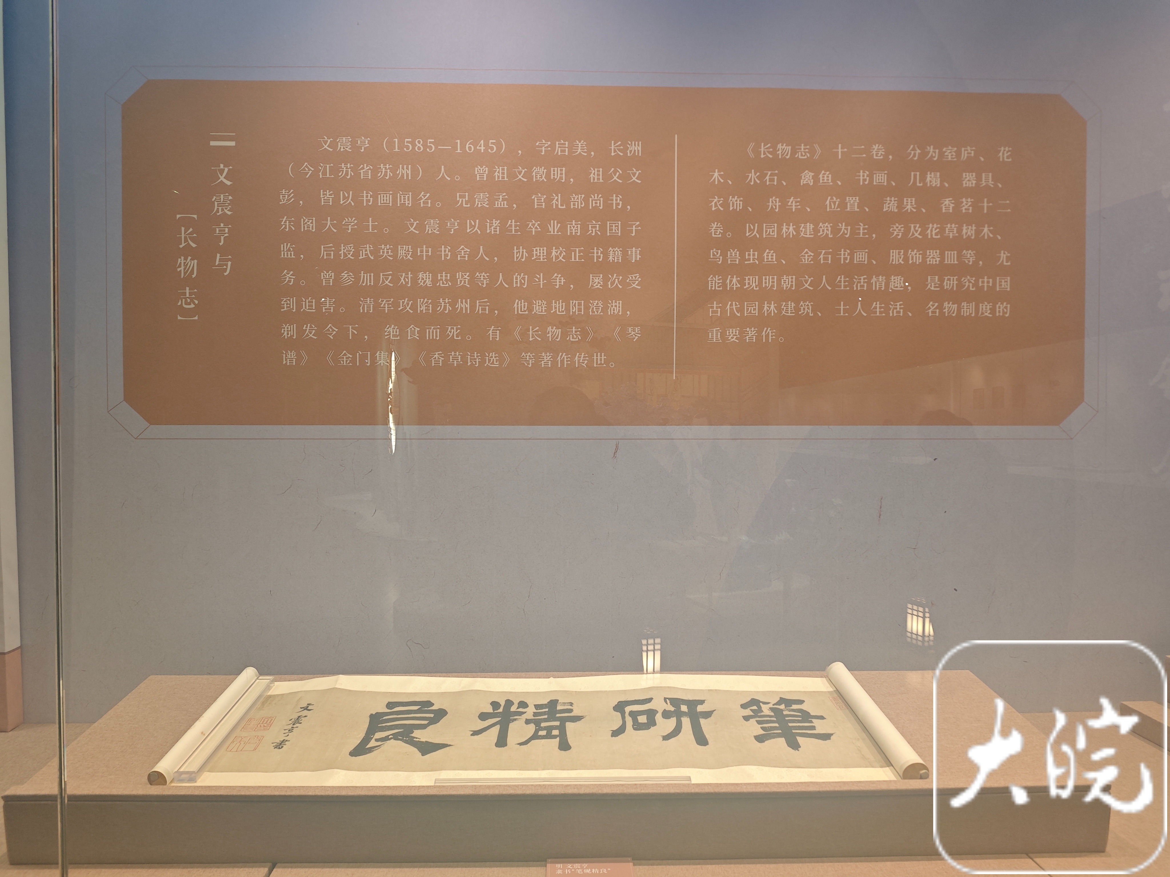 展览入口不远处,大皖新闻记者看到展台内摆放着一幅明代文人文震亨创作的《笔砚精良》书法作品,据了解,文震亨的曾祖父就是知名的书法家、画家文徵明。而展览的第一个单元就是以此幅作品为题,剩余三个单元分别为金石为友、茶酒斟酌、澄怀观物。