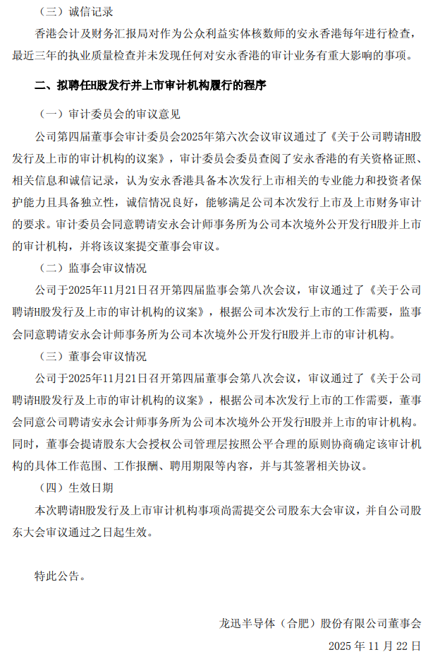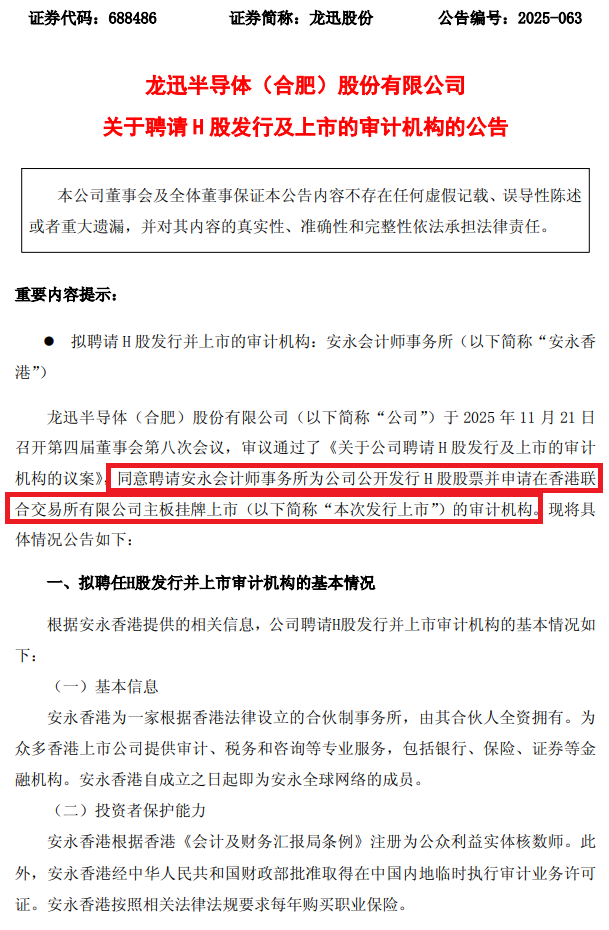 上交所科创板上市公司龙迅股份(688486.SH)于2025年11月22日发布了《关于聘请H股发行及上市的审计机构的公告》。公告显示,董事会同意聘请安永会计师事务所为公司公开发行H股股票并申请在香港联合交易所有限公司主板挂牌上市的审计机构。