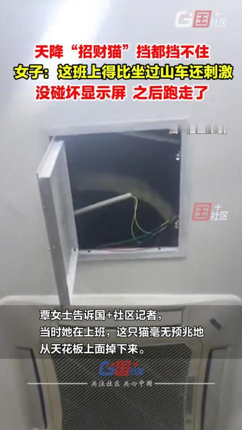 “解释不清了!”11月19日,湖北宜昌,一女子专心工作时,头顶突然传来异响,随后就有一只猫从天而降,摔在了桌子上!女子被这一幕吓得惊慌失措,因为楼上没有人,她想不明白猫是怎么上去的。网友:这是要来财了! 现在城市中随处可见流浪动物,一般情况下,它们会躲着人走,因为内心很害怕嘛,而且流浪动物的家也都藏在人迹罕至的地方,一些长期无人居住的房屋,很可能就会成为它们的家。 当天晚上,覃女士正在值班,她坐在电脑前认真处理着工作,忽然间,头顶传来咯吱咯吱的响动,但是她并未放在心上,因为楼上一直没有人,以为是自己听错了。 可就在这时,一只猫从天花板上掉了下来!直直的落在了覃女士面前,双方明显都很惊慌,白猫不断地挣扎着试图逃跑,将桌子上的显示屏、键盘弄得一团糟,最终找到门的位置跑了出去。 而覃女士也是扶完这个扶那个,忙得不可开交,缓了好一阵才从震惊中走出来。 第二天,同事们在得知了昨天晚上的惊魂事件后,也是打趣道“这班上得比坐山车还要刺激!” 网友看后表示,应该是楼上长期没人的缘故,所以流浪猫在楼上安了家,结果不知道怎么回事,钻进了天花板里,然后发生了这戏剧性的一幕。 信息来源:《11月19日,湖北宜昌。天降“招财猫”挡那挡不住,女子:当时吓得魂儿都要飞了,电脑显示屏没被损坏,之后它就跑走了。》国+社区
