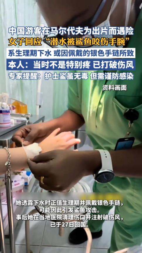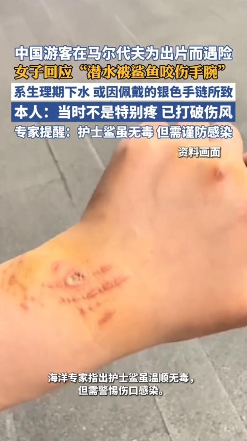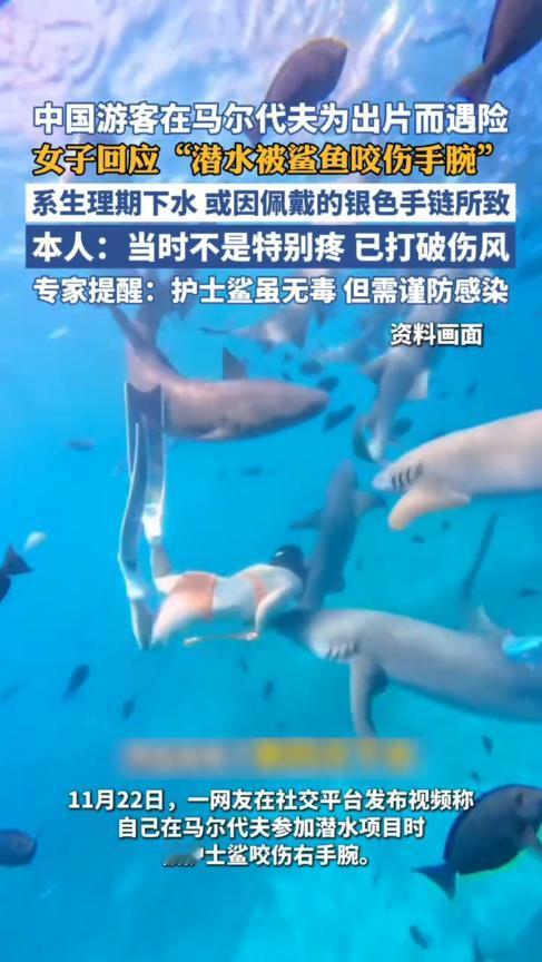 “这下后悔了吧!”11月22日,一中国女子在马尔代夫游玩时,明知自己正处在生理期,却还是坚持下海游泳,并且不断游向鲨鱼群,结果鲨鱼被血腥味吸引,咬伤了女子的手臂!大家都劝女子去医院治疗,可是她却毫不在意的表示:大不了就截肢。 对于鲨鱼这种危险的动物,很多人都以为它们会吃人,其实并不然,鲨鱼一般情况下不会攻击人,只有极少数的鲨鱼才会吃人,因为人对于鲨鱼来说并不符合做食物的要求,但是它们会因为好奇,咬上一口后离开。 当时,杨女士正在马尔代夫游玩,可不巧的是,这几天刚好是她的生理期,但是在了解到生理期可以下海游泳后,她还是义无反顾的跳了下去。 然而,在第4次下水的时候,意外还是发生了,一群鲨鱼在血腥味的吸引下,徘徊在杨女士身边,其中一条还咬伤了她的手臂。 杨女士却觉得没什么问题,但是导游坚持她上来,杨女士这才不情不愿的上了船,随后船长简单的给包扎了一下。 杨女士将视频发到网上后,不少网友都担心会因此感染,建议让她快去医院处理一下,可是杨女士却一点不在乎,一直哈哈大笑,认为完全是无稽之谈。 然而,杨女士的这个态度,却让网友们很生气,大家都是在担心她,可是她却像个没事人一样哈哈大笑,整得大家是在杞人忧天一样! 信息来源:《一名女子在马尔代夫生理期冒险潜水拍摄鲨鱼群时被咬伤,面对"感染截肢"警告却大笑回应"然后呢?",其叠加式危险操作和漠视健康的态度引爆全网争议。》中国蓝新闻
