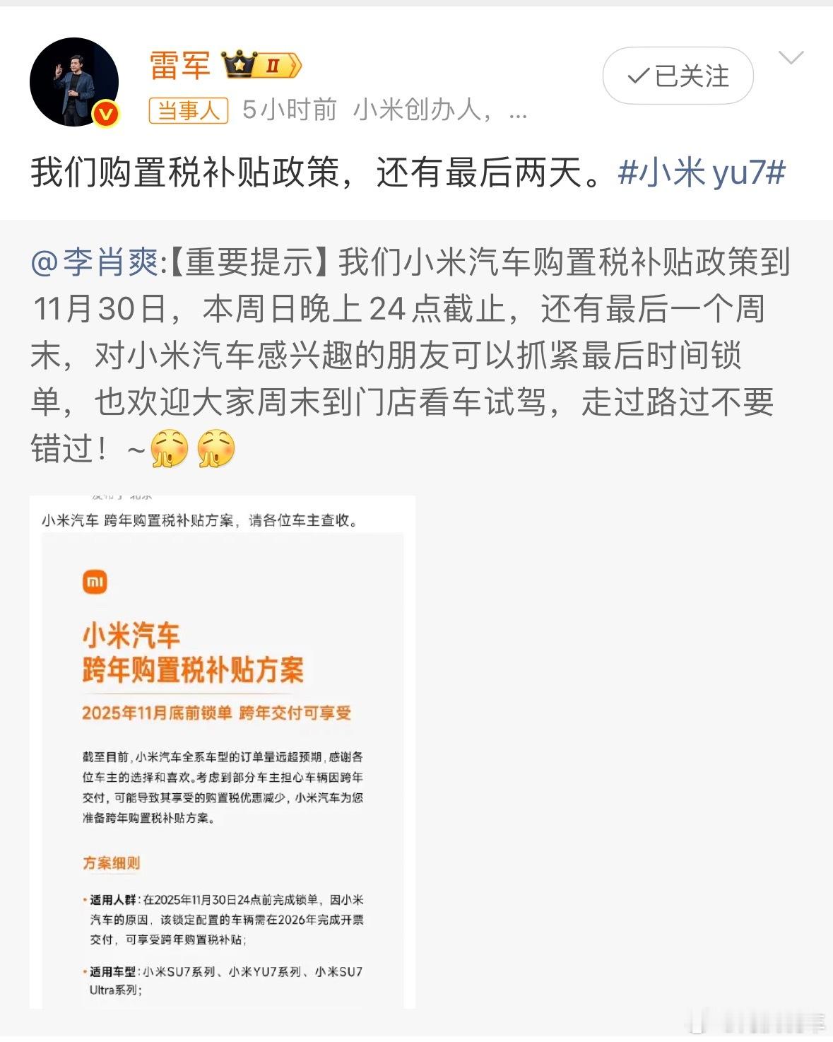 雷军发布小米购置税补贴重要提示购置税在明年将迎来重大变化,小米也将会两天后政策发生变化。有意向可以注意一下。