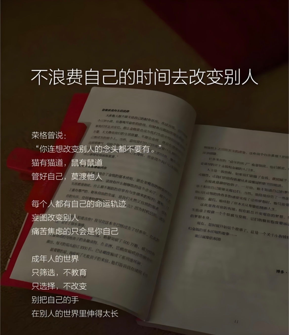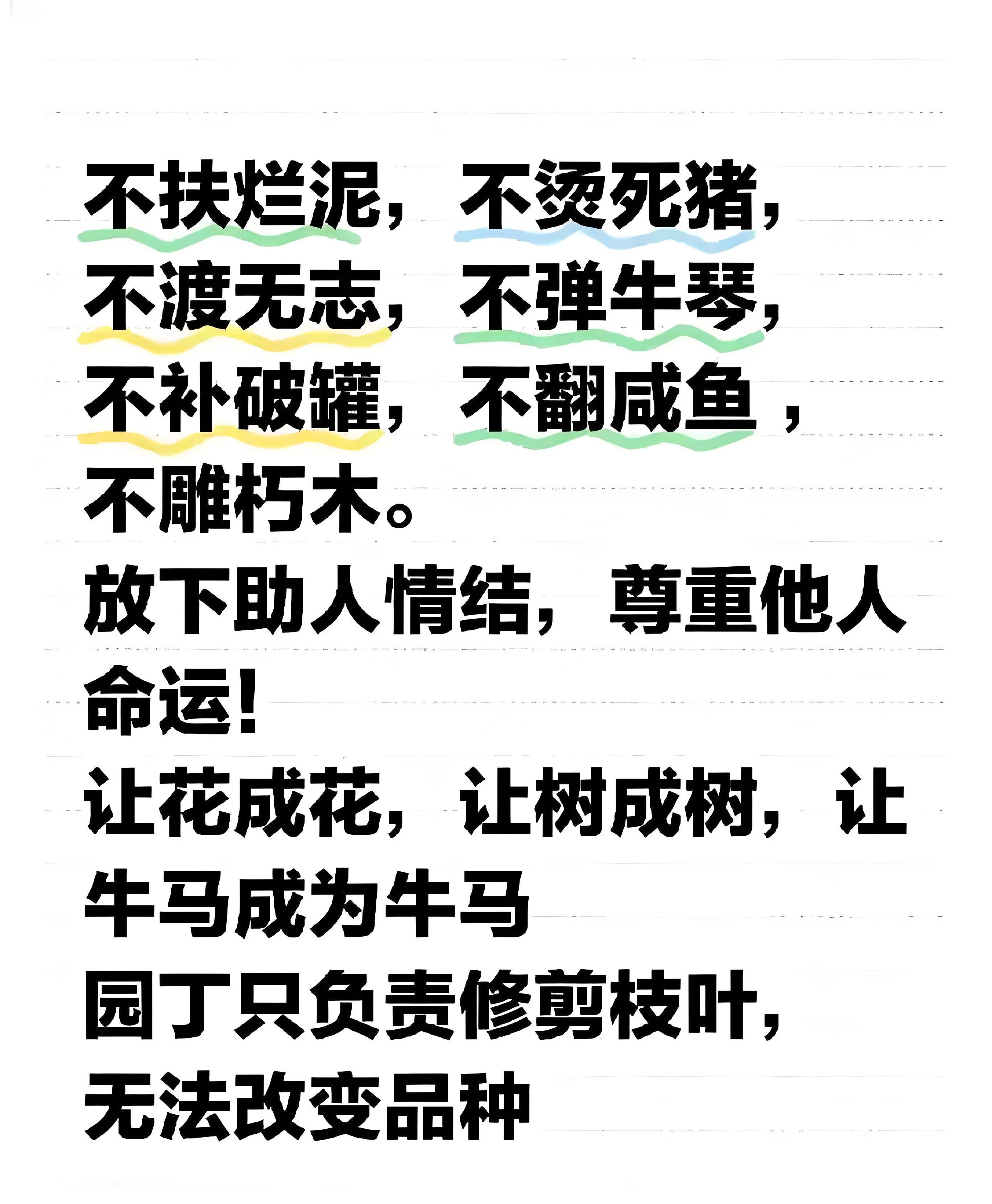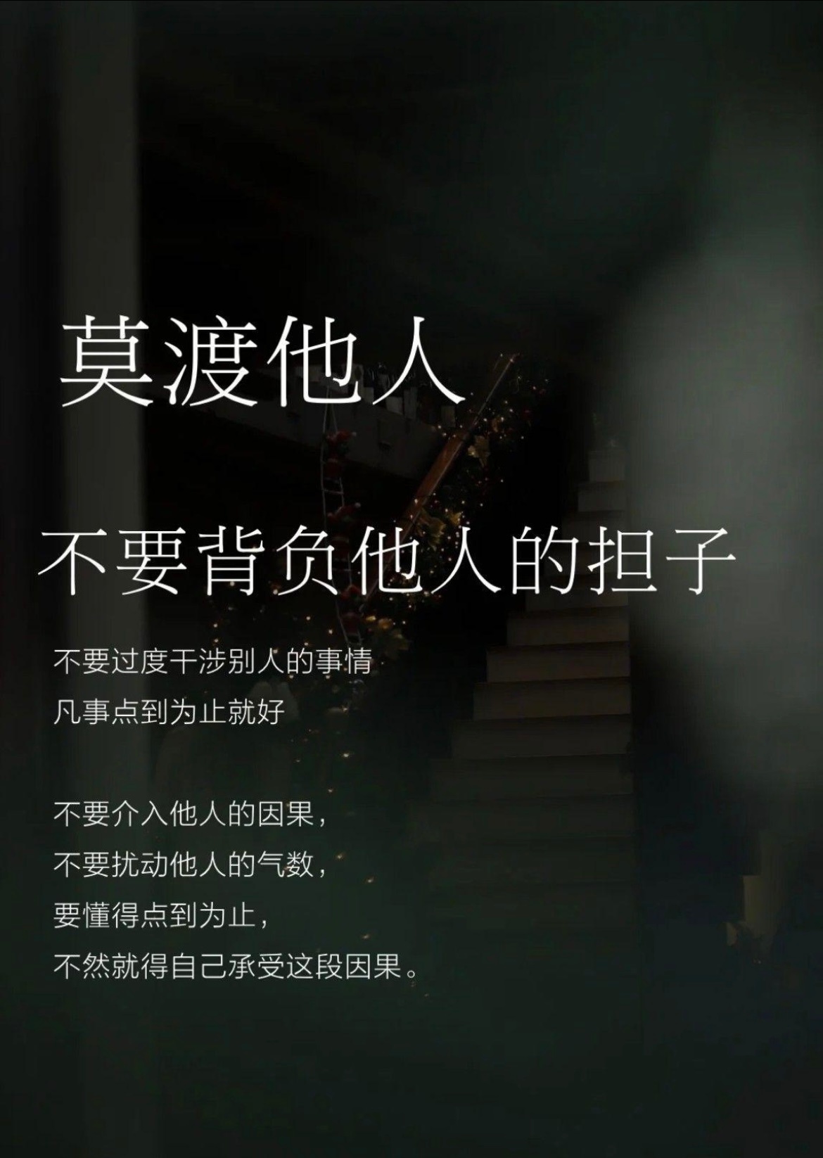 “阅己,越己,悦己;律己,慎言,慎行。”“好良言难劝该死的鬼,大慈悲不渡自绝人。”“成年人的世界,只筛选,不教育。”“风来疏竹,风过而竹不留声; 雁渡寒潭,雁去而潭不留影。”“我允许任何事情的发生。我允许,事情是如此地开始,如此地发展,如此地结局。”