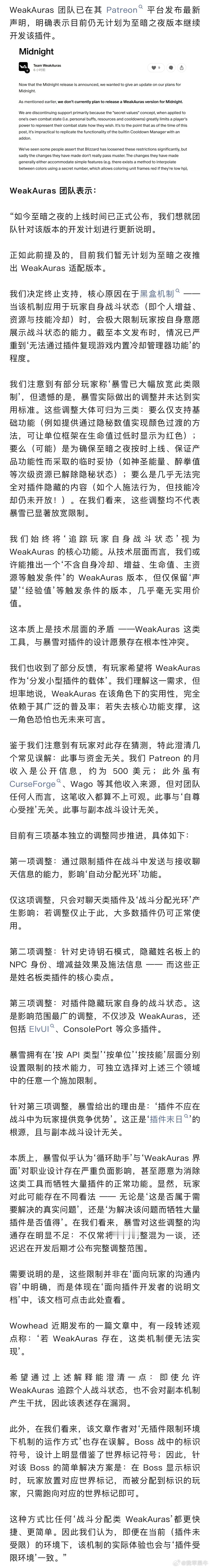 暴雪游戏总监前段时间和博主连线时,称将放宽部分插件限制,这个消息玩家们一听,立马就去WA那问了:暴雪放宽限制,你们还会更新吗?WeakAuras 团队已在其 Patreon 平台发布最新声明,明确表示目前仍无计划为至暗之夜版本继续开发该插件。魔兽世界魔兽世界