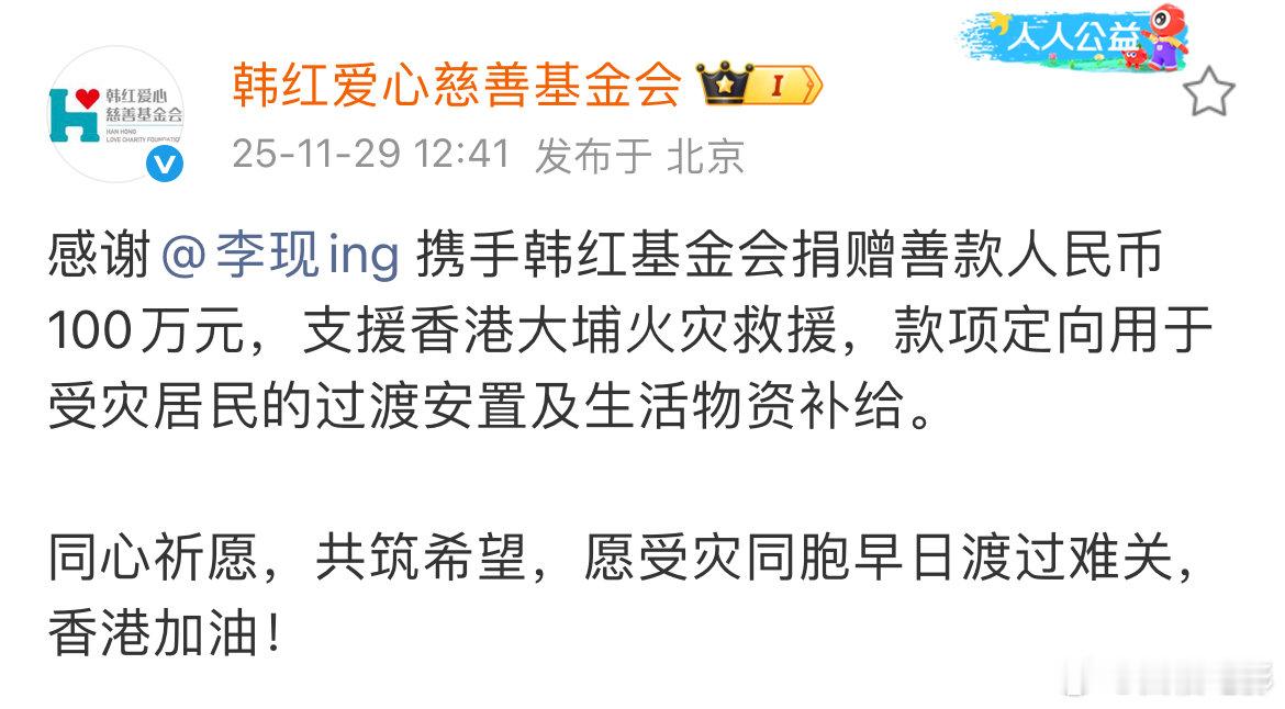 李现捐赠香港100万元李现为香港捐赠100万元 李现捐赠香港100万元!李现携手韩红爱心慈善基金会 为香港捐赠100万元,支援香港大埔火灾救援,款项定向用于受灾居民的过渡安置及生活物资补给。 易梦玲为香港捐款100万