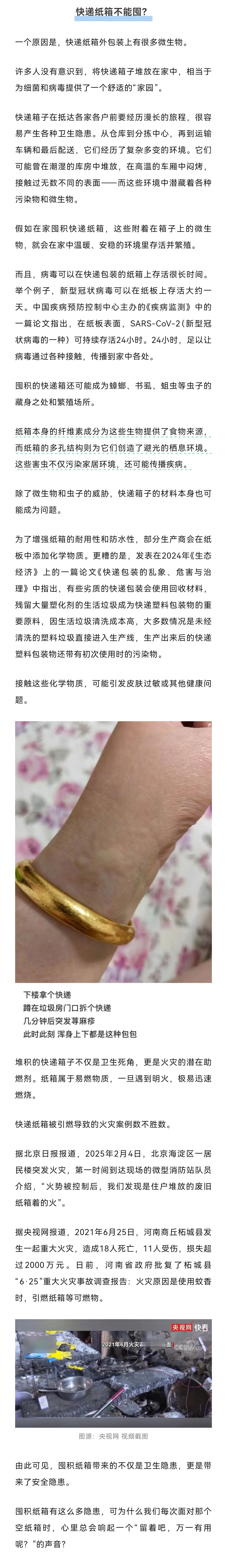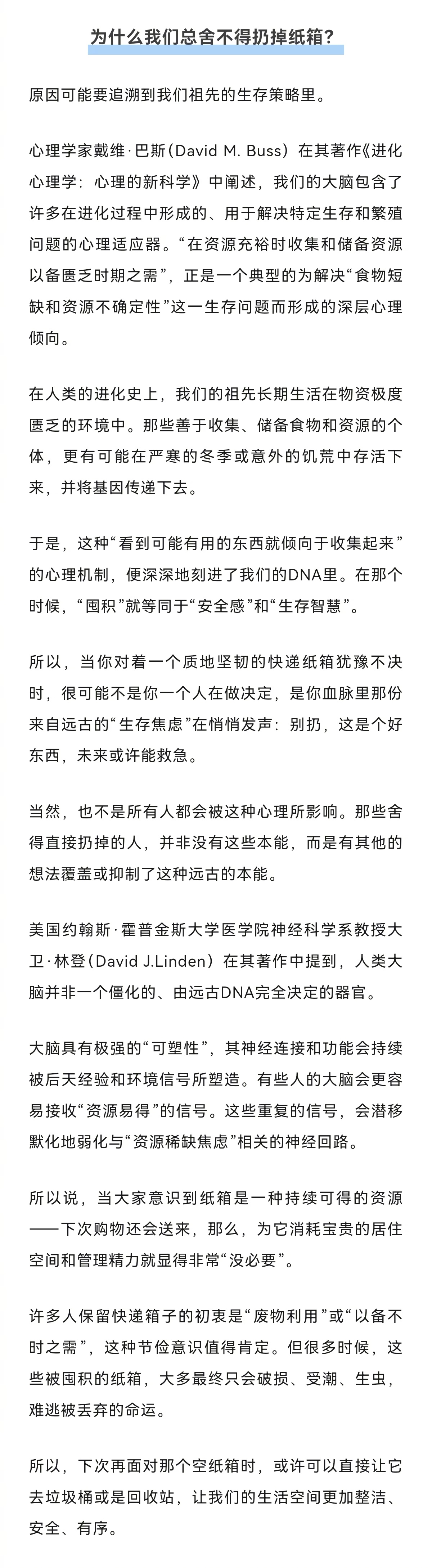 【快递纸箱为什么最好是拆完即扔?】为什么我们总舍不得扔掉纸箱 双十一刚过去,双十二又要开始,大家肯定都网购了不少东西。国家邮政局数据显示,今年10月,快递业逐渐步入业务旺季,业务量稳步增长,市场规模加速增长。相应地,装快递的箱子也越来越多出现在家中。现在不少人都喜欢把快递纸箱留着,想着“总有一天能用上”。然而,越来越多的专家和机构却提出建议:快递箱子最好拆完即扔。这究竟是为什么呢?你怎么处理快递纸箱?(壹读)