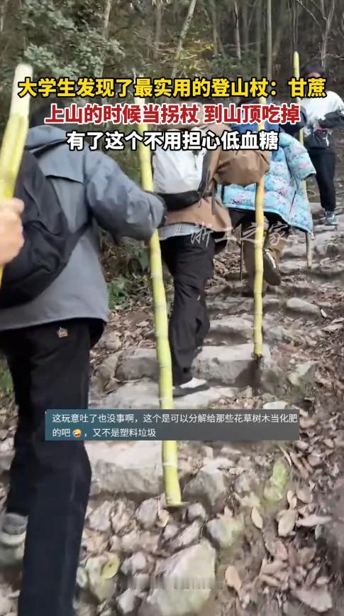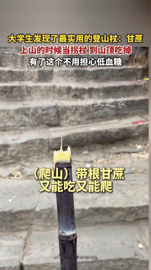“人怎么能这么聪明!” 近日,浙江义乌,一群大学生爬山时,没有买下山昂贵的登山杖,而是人手一根甘蔗,既能当登山杖用,爬累了还能嚼两口补充能量,就算随地吐掉,也不会污染环境!网友:年轻人的脑子就是灵活! 不知道大家有没有爬过高一点的山,不仅是对体力的挑战,还需要顽强的精神,而对于喜欢爬山的人来说,登山杖那是必不可少的装备。 据媒体11月26日的报道,前不久,一对情侣爬山时,由于准备的不充足,爬到半山腰就已经累得不行了,书包里也没有太多的食物补充体力,一度想要放弃。 就在二人犹豫要不要继续时,身旁一伙大学生拄着甘蔗经过,二人瞬间瞪大了眼睛,没想到他们竟用甘蔗当做登山杖,不仅功能上没有差异,而且累了渴了直接就能啃上两口,及时补充能量。 二人望着自己手里的登山杖,瞬间有些后悔,早知道就不花这冤枉钱了!真是得多向年轻人学习学习。 网友看后表示,不愧是大学生,思考问题的方式真是独特,这种一举两得的法子都能想出来,太佩服了! 还有网友看到了商机,既然如此,那么在山脚下或者山上卖甘蔗,是不是也能赚上一笔钱? 信息来源:《最实用的登山杖竟是甘蔗?!经济实惠,能食用又实用~》美丽浙江
