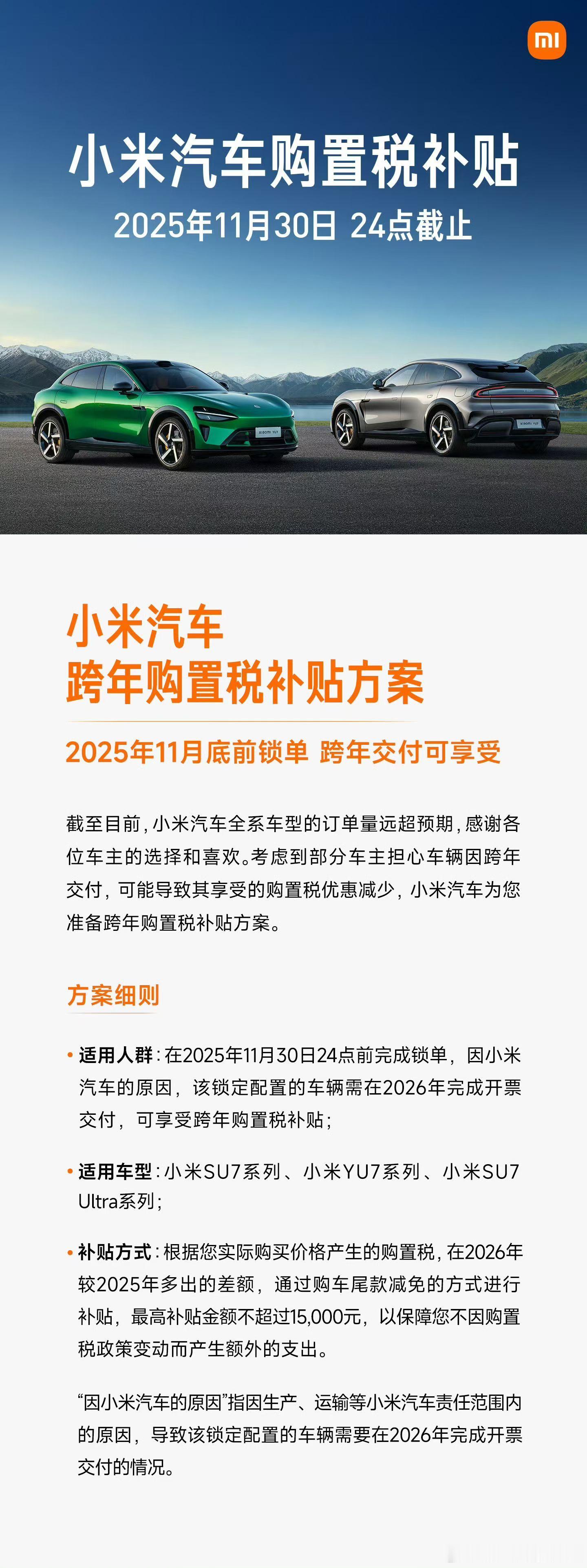 小米购置税补贴最后48个小时了,大家去店里报我名字……应该也不打折。要不这两天下单的朋友,凭汽车订单找我来一起好好吃饭,香港咱就米其林一乐烧鹅,深圳就德记隆江猪脚饭小米科技