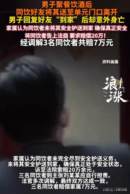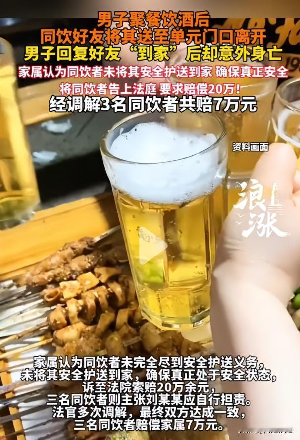 内蒙古鄂尔多斯,刘某某与3个朋友喝酒到凌晨四点多,散场后朋友将他送到单元门口,看着他进去才离开。之后朋友发消息问刘某某是否到家,刘某某还回复到家了。可不久后,朋友接到警方电话,得知刘某某意外去世。家属认为朋友没把刘某某送进家门,没尽到责任,将3人告上法庭索赔20多万,结局让仨朋友长了教训。 刘某某和三个铁哥们相聚吃饭,酒桌上大家推杯换盏,一直喝到凌晨四点多才散场。 三个朋友见刘某某喝了不少,怕他路上出事,便开车把他送回小区,送到单元门口,看着他进去才放心离开。 这刘某某啊,平时就好喝两口,这次和哥们儿聚在一起,那更是喝得畅快淋漓。 凌晨四点多,酒局才散,仨朋友想着刘某某喝成那样,可不能让他自己回家,便开车把他送回了小区。 到了单元门口,仨朋友还不放心,一直看着刘某某进了单元门,这才开车离开。 其中一个朋友到家后,心里还是七上八下的,就给刘某某发了条消息,问他到家没。 刘某某很快回了消息,说到家了。 朋友这才松了口气,觉得没什么事了。 可谁能想到,没过多久,这朋友就接到了警方电话,说刘某某出意外去世了。 这消息,把仨朋友都给震懵了。 他们怎么也想不明白,自己明明把刘某某送到了单元门口,还确认他进了门,怎么还会出这样的事呢? 刘某某的家属觉得,仨朋友没把刘某某送进家门,就是没有尽到责任。 要是他们能把刘某某安全送到家里,说不定就不会出这样的事了。 于是,家属一纸诉状,把仨朋友告上了法庭,要求他们赔偿20多万。 这仨朋友觉得自己已经做得很到位了,怎么还要承担赔偿责任呢? 法官受理了这个案子后,多次组织双方进行调解。 可双方各执一词,谁也不肯让步。 家属觉得,仨朋友必须为自己的疏忽负责,赔偿20万一点都不多。 仨朋友则认为,自己已经把刘某某送到了单元门口,还确认他进了门,之后的事儿自己根本无法控制。 而且刘某某作为成年人,自己过量饮酒,也应该承担一部分责任。 有人觉得,仨朋友确实有责任,毕竟刘某某是因为和他们一起喝酒才出的事。 也有人觉得,家属的要求有点过分了,仨朋友已经做得很好了。 从法律角度来说,这事到底该怎么认定呢? 《民法典》里,虽然没有明确规定共同饮酒者要承担什么样的责任,但在司法实践中,一般认为共同饮酒者之间有相互照顾、提醒的义务。 就像这仨朋友和刘某某一起喝酒,他们就有义务提醒刘某某不要过量饮酒,在刘某某喝醉后,也有义务将他安全送回家或者交给能照顾他的人。 仨朋友把刘某某送到了单元门口,还看着他进了门,这在一定程度上已经履行了自己的义务。 但他们仅仅收到刘某某回复到家的消息,并没有进一步确认刘某某是否真的安全到家,比如到刘某某家里看看,或者和刘某某家里其他人取得联系。 从这方面来说,仨朋友可能没有完全尽到合理的护送照顾责任。 民法典第一千一百六十五条规定,行为人因过错侵害他人民事权益造成损害的,应当承担侵权责任。 仨朋友没有完全尽到照顾义务,存在一定的过错,所以可能要承担一定的赔偿责任。 但刘某某作为成年人,他应该清楚自己的酒量,过量饮酒导致意外发生,他自己也有过错。 民法典第一千一百七十三条规定,被侵权人对同一损害的发生或者扩大有过错的,可以减轻侵权人的责任。 所以,不能把责任都推到仨朋友身上,刘某某自己也要承担一部分责任。 这也是在调解时,考虑的一个重要因素。 最终,在法官的耐心劝说下,双方各退一步,达成了调解协议。仨朋友共同赔偿刘某某家属7万元,并且现场先交了一部分钱。 仨朋友已经做得很好了,为什么还要赔偿呢? 这是因为虽然他们把刘某某送到了单元门口,但没有进一步确认其安全到家,在法律上可能被认定为没有完全尽到合理的照顾义务。 所以,根据过错程度,他们需要承担一定的赔偿责任。 如果刘某某是自己主动要求独自回家,仨朋友还需要承担责任吗? 如果仨朋友知道刘某某当时的状态,不适合独自回家,却没有阻止或者没有采取合理的措施,他们还是可能要承担一定的责任。 但如果他们已经尽到了提醒和劝阻的义务,刘某某仍然坚持独自回家,那么仨朋友的责任可能会相对较轻。 共同饮酒,一定要把照看义务落实到位。 以后喝酒可得长点心,不仅要自己适量,还得照顾好一起喝酒的人。 在享受饮酒乐趣的同时,也要时刻牢记自己的责任和义务。 遇到类似情况,要积极履行照顾义务,避免类似的悲剧再次发生。