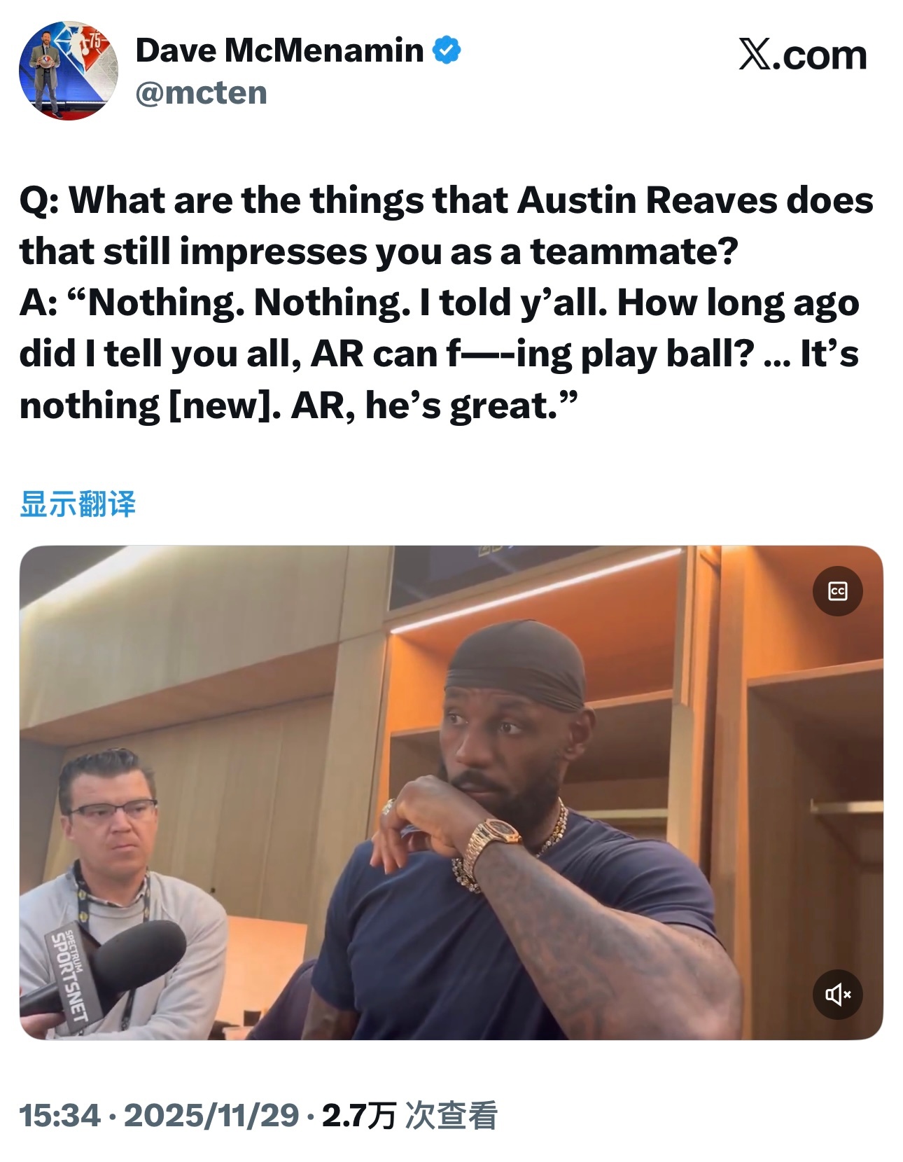 谈到里夫斯的惊人表现,詹姆斯对记者表示:“我早就跟你们说过,我多久之前就跟你们说过,奥斯汀打球真TM好,这没什么新鲜的,AR真的很棒。至于争夺杯赛冠军,我们只是专注打好眼前的每一场比赛。我认为最重要的是我们很开心能持续赢球,并且按照既定战术部署的方式去赢下比赛,这对我们当下来说才是最关键的。”