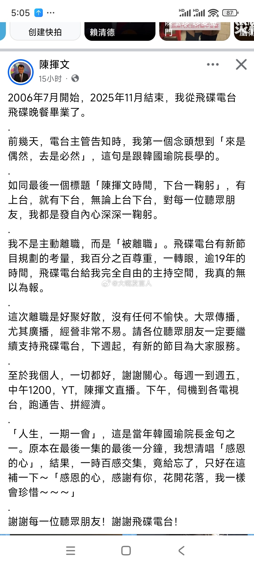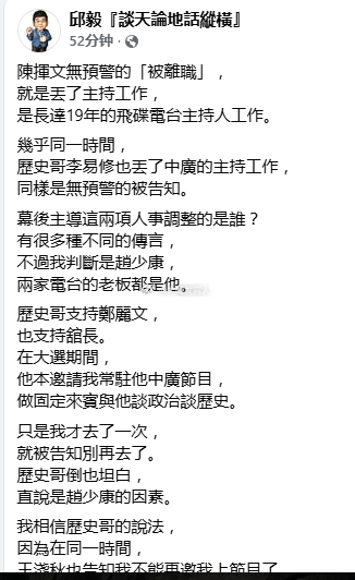 陈挥文这种杠精,被单位清退了 补发图3,邱毅认为是黎少康在背后使坏。蓝蛙阵营的戏不少呀在一个只问立场、不论是非的地方,他这种杠精,骂蓝骂绿骂白,确实不会交到哪一方的长期朋友。另外按他在电台做视频后在油管上的可怜播放量,电台能容他这么些年,也算给他送福利了。本质上,这孙子是只绿蛙,因为Y甚至反对韩国瑜要求赖皮德撤回大陆是境外敌对势力的观点,挥文绿蛙坚定认为,大陆就是境外敌对势力。热点观点 ,中国台湾省,台湾人也是中国人