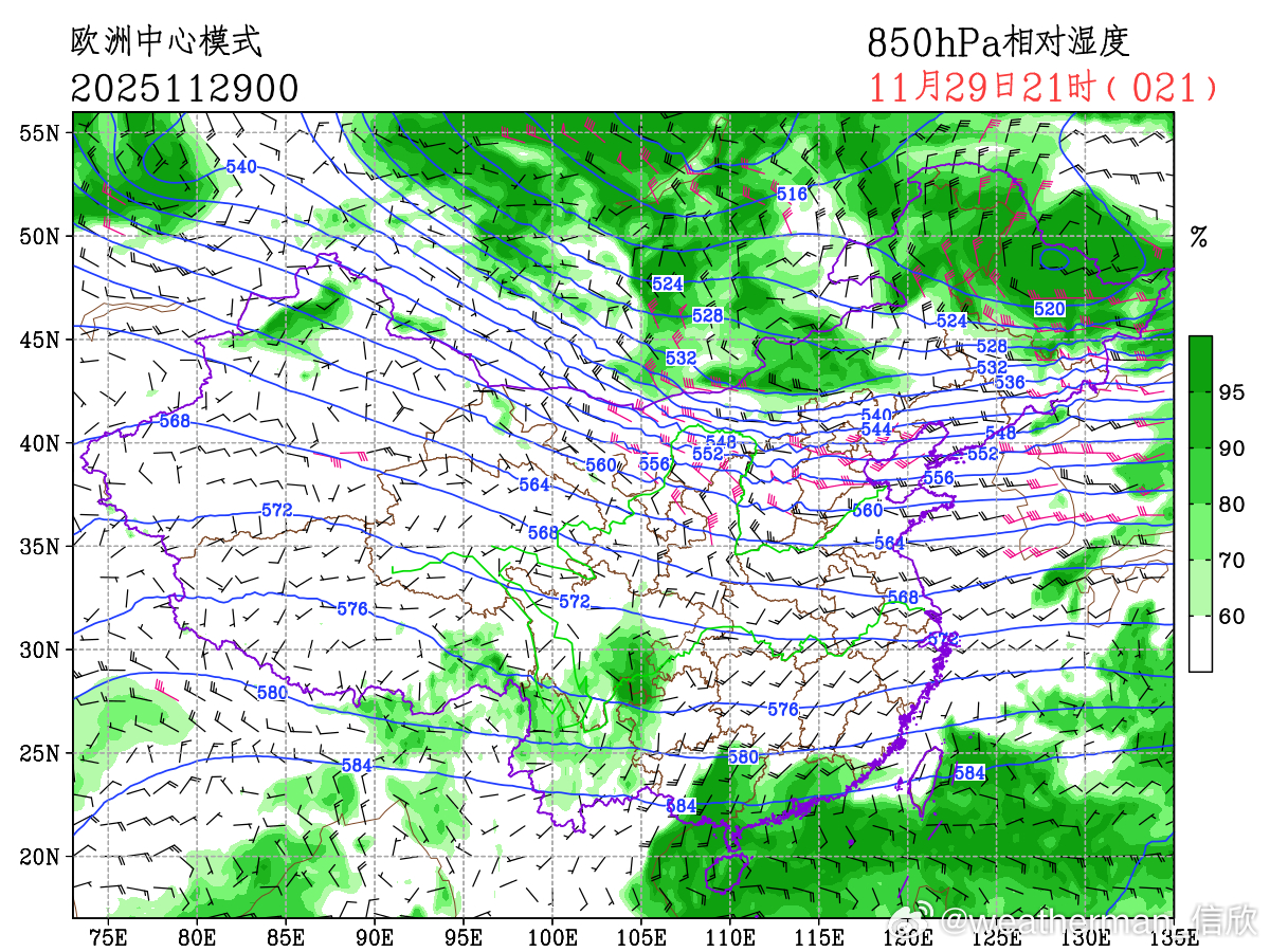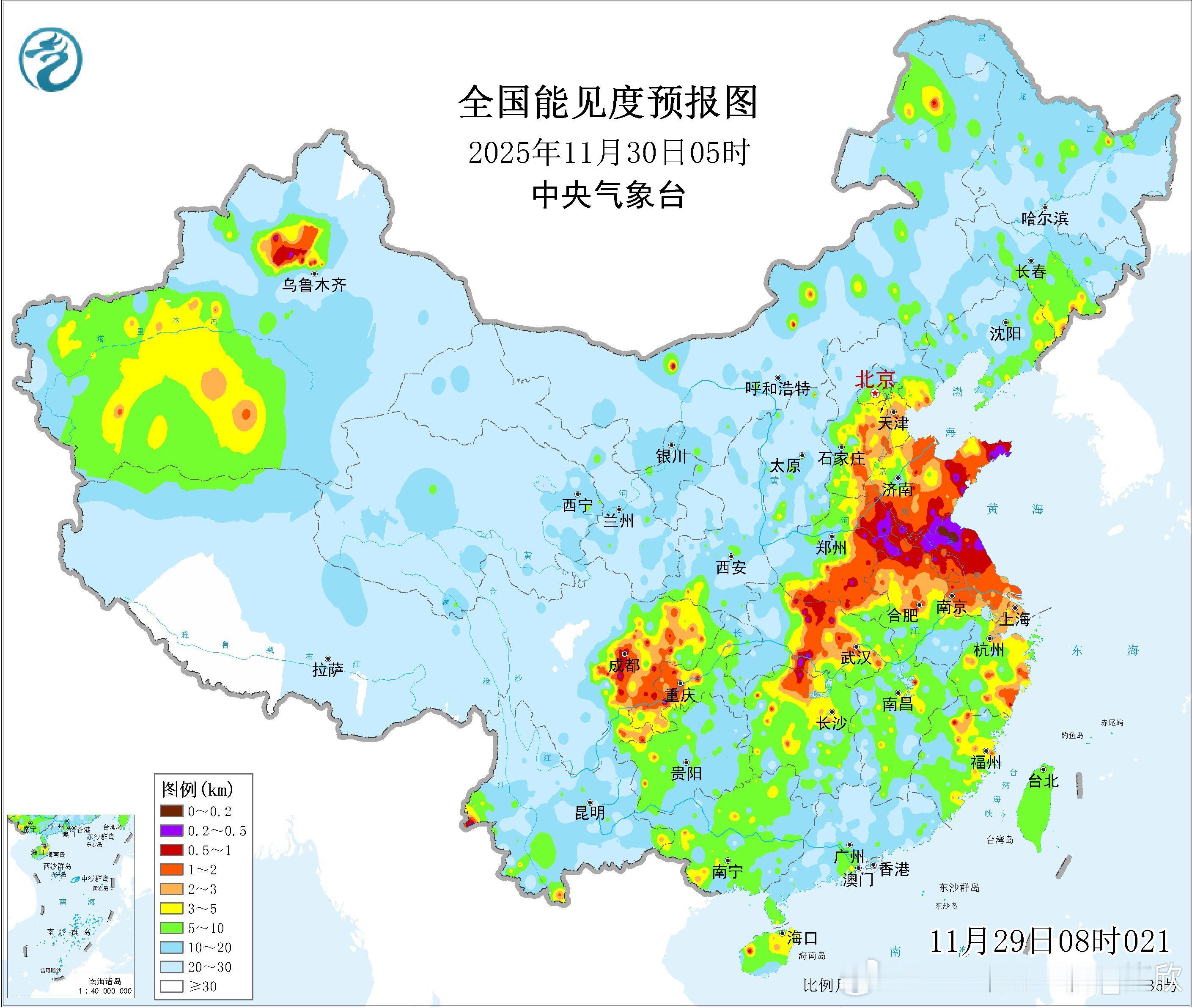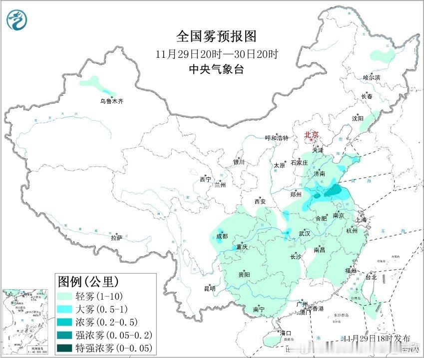 【雾】预计29日夜间至30日上午,山东东部和南部、江苏北部、安徽北部、河南东部、湖北中部、四川盆地西部和南部等地的部分地区有大雾天气,局地有能见度不足500米的浓雾。从数值预报看,黄淮一带以及四川盆地,近地面湿度大,850百帕为干区,500百帕为西北气流,这样的配置,利于夜间-清晨,晴空辐射降温,导致水汽凝结形成大雾。