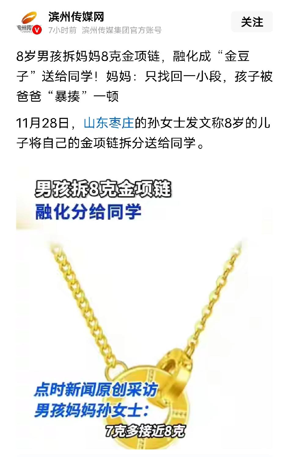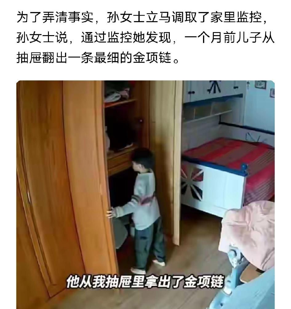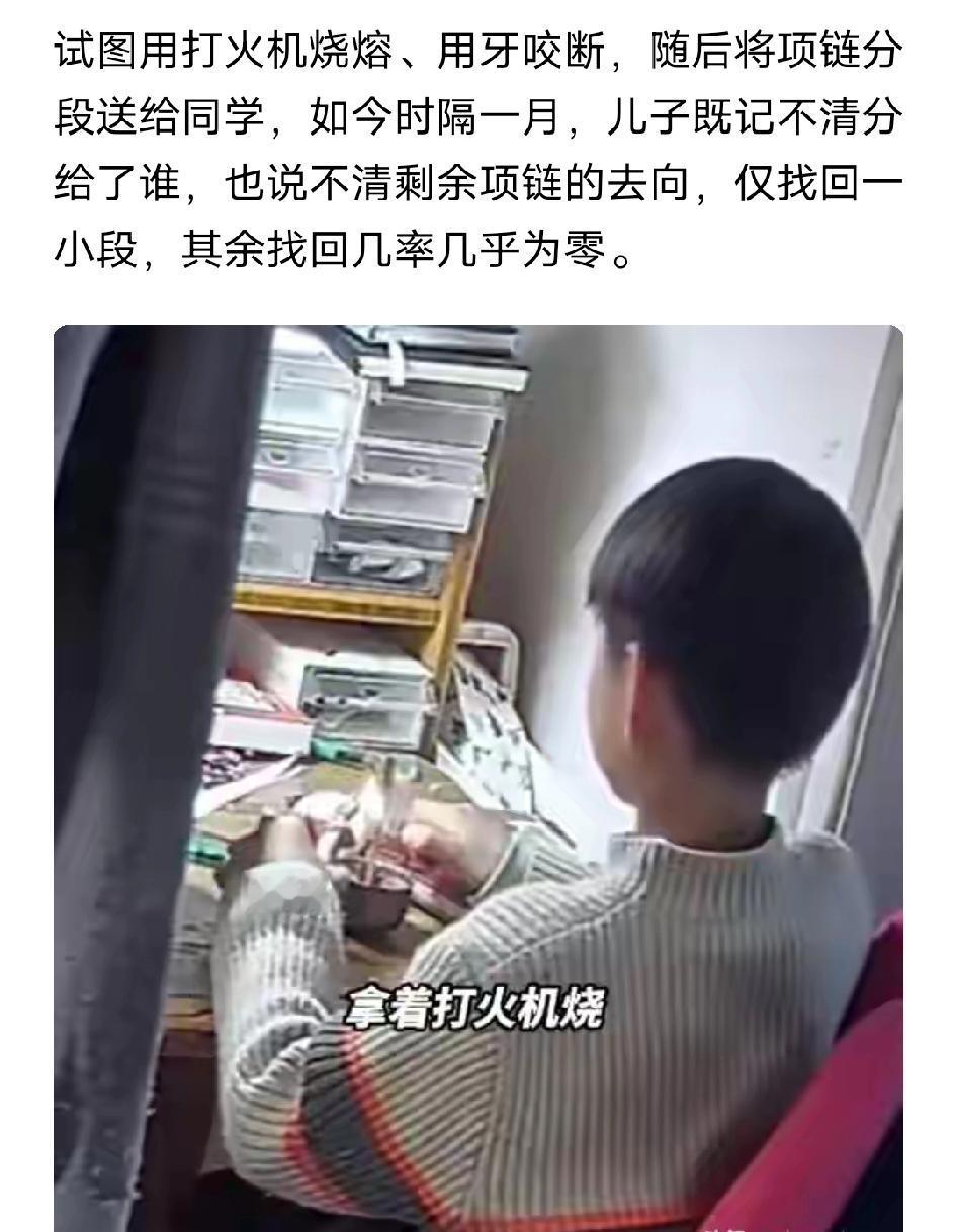 “万万没想到啊!”山东枣庄的孙女士称,8岁的儿子将自己的金项链拆开分给了同学。 不得不说,这个小男孩也太让人不省心了。孙女士调出自家监控,发现儿子从抽屉里找出金项链,还试图烧金项链。男孩将金项链融化分给了同学,说不清楚剩余的去向,找不回来了。 此事引起网友热议,有网友说:“找不回来了,我女儿学校有人送戒指,然后女孩子不要,男孩子扔了。” 还有网友说:“不知道他怎么不送别的,还剪成一段段的送人,真不知道贵他就不会挑一条细的了,他都拿出来一人送一个了。” 也有网友说:“ 以前我也到处放,有次发现儿子老是来摸一摸,我赶紧藏起来了。” 没想到,这些首饰没有被贼惦记,却被家里面的孩子给惦记上了。 有些事情真的得防着点家里面的孩子 。 孩子也许是无心的,并不知道这些东西的贵重程度 ,可能就是当做普通的东西送给了同学,所以家长们要把贵重的东西收藏好 。 对此你有什么看法? (信息来源:滨州传媒网)