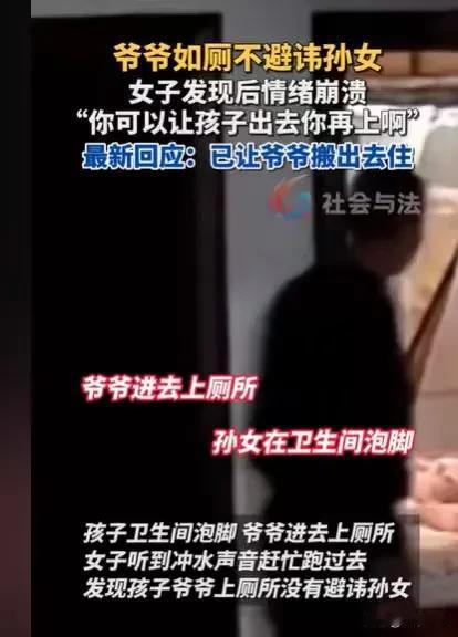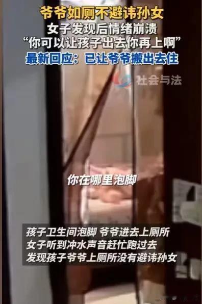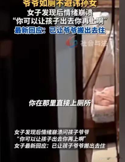 重庆,一个小女孩正在厕所泡脚,爷爷进来了,居然当着孙女的面尿尿,女子听到水声之后,才发现这件事,她马上大声质问公公,为何不让孩子先出去,公公辩驳道,是孩子没有出去。 一声冲水声,吸引了女子的注意,女子以为是自己的女儿在上厕所,就赶紧问女儿在哪里泡脚。 女儿回答是在厕所里,女子马上慌张了,因为她看到公公也正好去厕所,这冲水声应该是公公上了厕所冲水的。 公公在厕所尿尿,女儿在里面泡脚,女子一想到这场面,就感到非常的崩溃,她赶紧跑了过来。 事情果然如她所想一般,女儿正在里面泡脚,公公正好上完厕所出来。 女子忍不住大声质问公公“老爸,你怎么可以这样,你可以让孩子先出去,你再上啊!” 老人却一脸无所谓的样子,是孩子不出去。 看到老人这样子,女子情绪真的崩溃了,她非常的无奈,老人就是这样的,上厕所一点都不避讳她的女儿。 虽然她的女儿还不是很大,但是女孩子不比男孩子,公公如果一点都不避讳,这对孩子的成长会造成非常大的影响。 如果长此以往,孩子慢慢长大,公公还是一直不避讳,这真的是一个很大的问题。 女大避父,男大避母,女孩子会慢慢长大,不但要避开父亲,还要避开家里的其他男子。 如果家中的男子都不避讳,女孩的成长环境真的会很糟糕。 女子考虑到这些,她再也不想和公公住在一起了,为了女儿的成长,她请公公搬了出去。 发生这种事情,确实令人感到不可思议,或许在老人眼里,孩子只是孩子,她还小,什么都不懂。 可他忘了,如果他不避讳,养成习惯,孩子在慢慢长大,将会给孩子造成一定的心理影响。 从情感方面来说,女孩的成长,不但要有优良的环境,还要有家里人正确的引导,教育她们与男子如何相处。 不管是父亲也好,爷爷也好,叔叔也好,他们虽然是亲人,但是他们的隐私应当管好,不可轻易让女孩子看到,否则就会影响女孩的一生,有可能还会成为他们的心理阴影。 她们小的时候可能不懂, 但长大了会回想起这些画面,这些画面会影响她们的一生。 从理这方面来说,女子因为公公不避讳他的女儿,女子就将公公请去外面住,这好像是不讲理的,但是爷爷当着孙女的面尿尿,这更是不合理,为了女儿的成长,女子让公公搬出去,这是非常合理的。 从法律方面来说,公公当着孙女的面尿尿,他主观意识可能并不是要伤害自己的孙女,并不构成违法行为,他只是没有注意而已。 但是他的行为不但不利于女孩的成长,更不利于家风建设。 《民法典》第1043条规定:家庭应当树立优良家风,弘扬家庭美德,重视家庭文明建设。夫妻应当互相忠实,互相尊重,互相关爱;家庭成员间应当敬老爱幼,互相帮助,维护平等、和睦、文明的婚姻家庭关系。 女孩的成长,需要一家人的呵护,只有家人用心呵护孩子的成长,孩子的心理阴影才会少一些。 那么你是如何看待这个爷爷的行为呢?