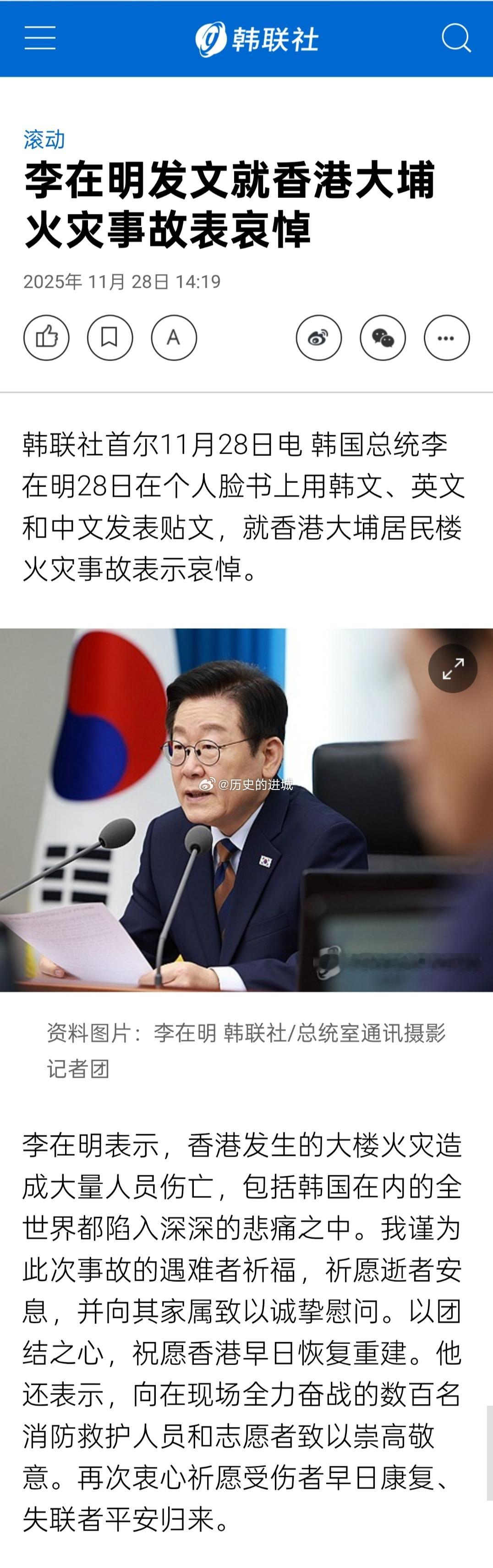 香港大埔火灾已致128人遇难韩国总统李在明28日在个人脸书上用韩文、英文和中文发表贴文,就香港大埔居民楼火灾事故表示哀悼。李在明表示,香港发生的大楼火灾造成大量人员伤亡,包括韩国在内的全世界都陷入深深的悲痛之中。我谨为此次事故的遇难者祈福,祈愿逝者安息,并向其家属致以诚挚慰问。以团结之心,祝愿香港早日恢复重建。他还表示,向在现场全力奋战的数百名消防救护人员和志愿者致以崇高敬意。再次衷心祈愿受伤者早日康复、失联者平安归来。老李还是懂人情世故的。